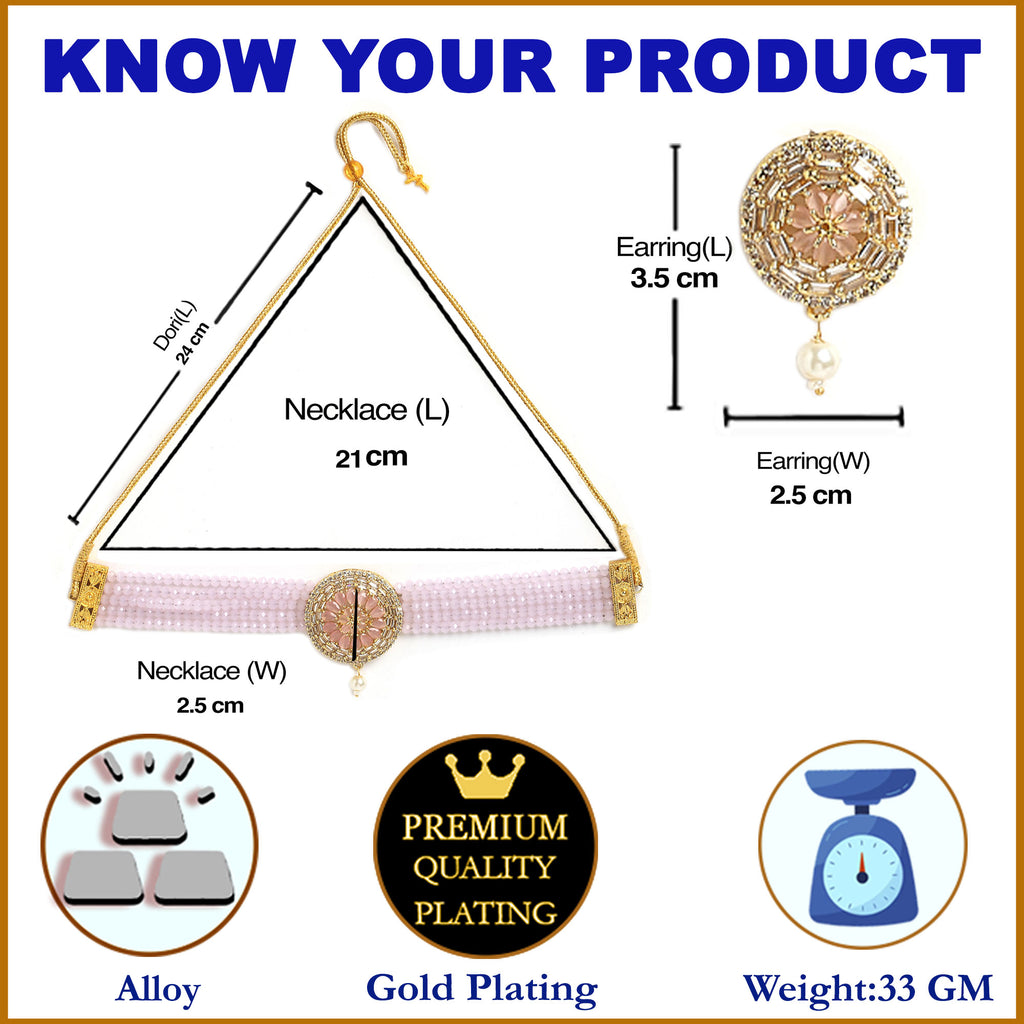 This jewellery set consists of a necklace and a pair of earrings. Gold-Plated antique chokar necklace, has peach-toned American Diamond-studded and pink beaded detail secured with a drawstring closure. A pair of matching Peach Stone Studded studs, secured with a post and back closure.