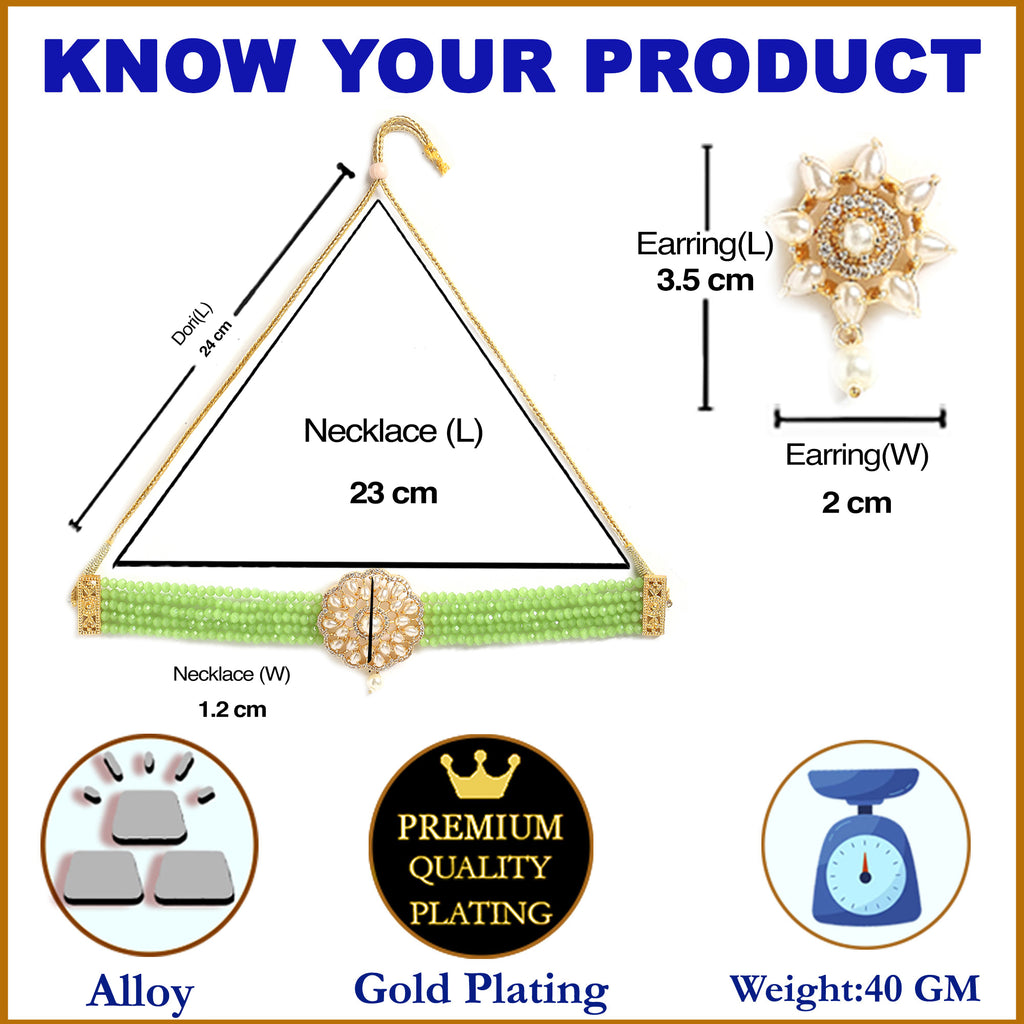 Gold-Plated Pearl Detailing Lime Green Beads Strap Choker Jewellery Set