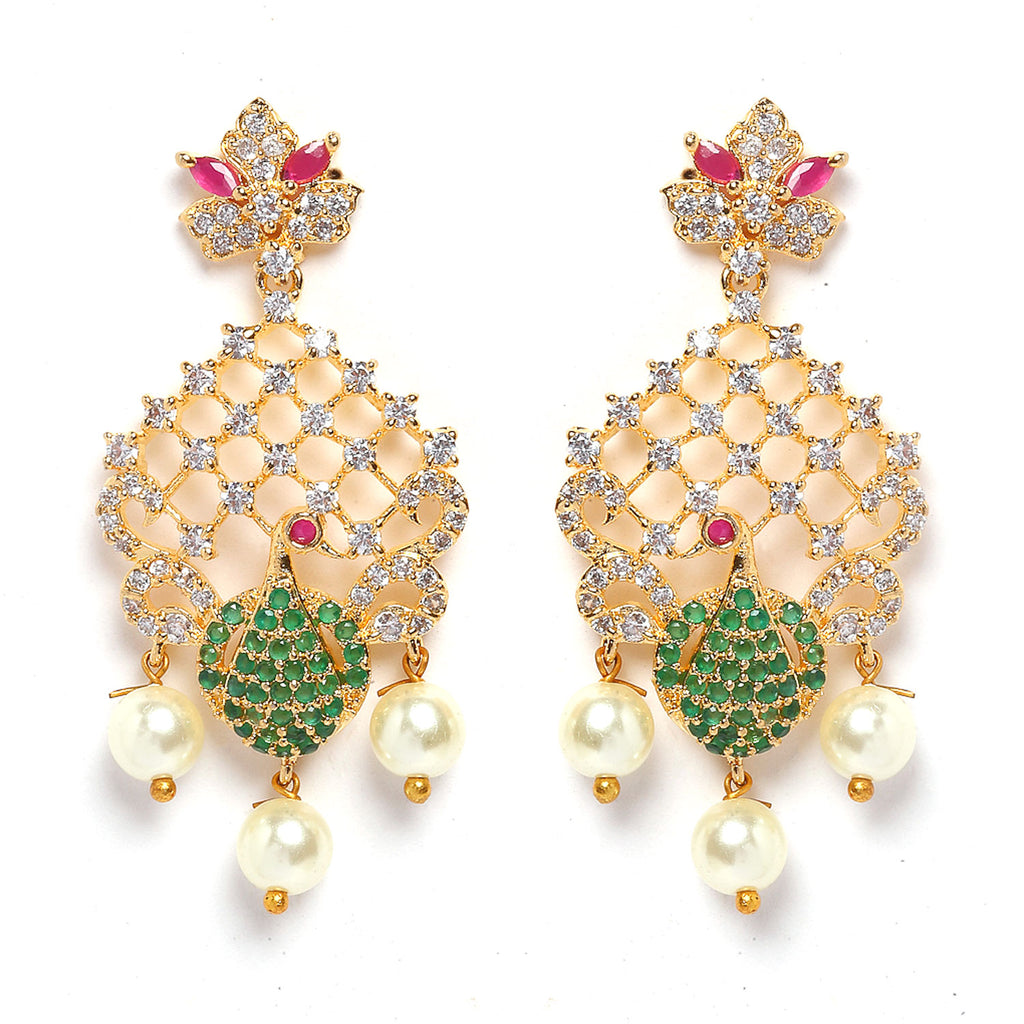This jewellery set consists of a necklace and a pair of earrings. Gold-Plated White, Red and Green AD-studded and beaded handcrafted necklace, has intricate work detailing, Secured with a drawstring closure. A pair of matching drop earrings, each secured with post and back closure.