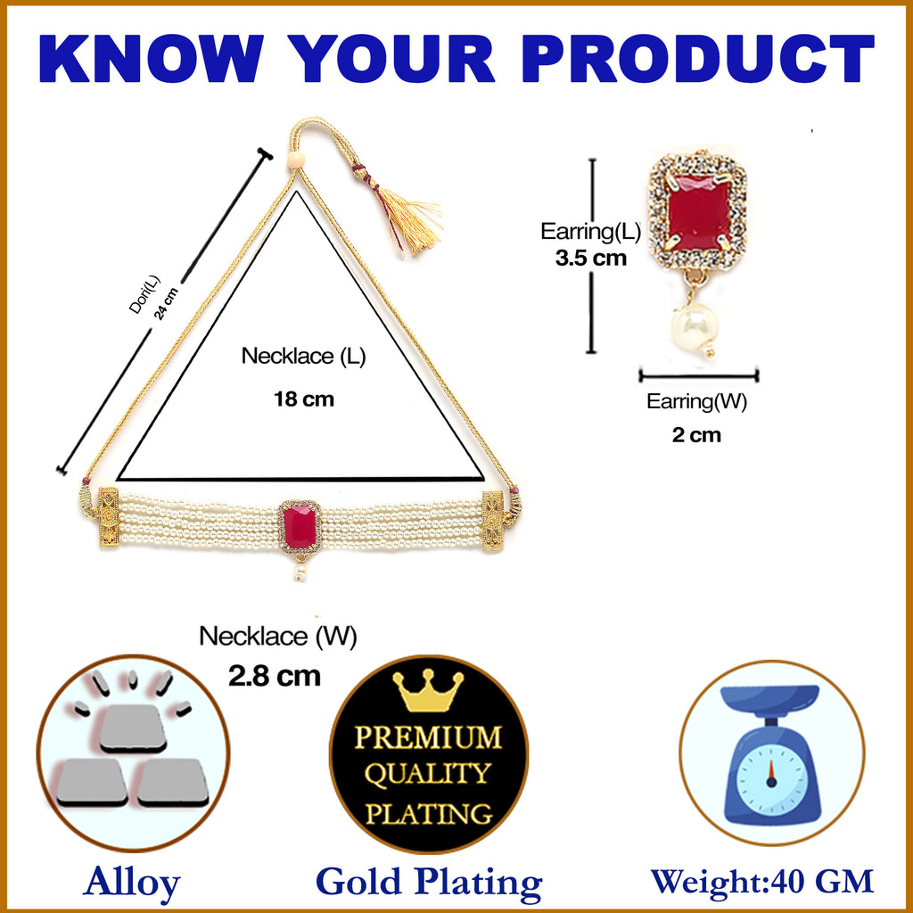 This jewellery set consists of a necklace and a pair of earrings. Gold-Plated White Pearl beaded necklace, has red artificial stone-studded detail, secured with a drawstring closure. A pair of matching stud earrings, each secured with a post-and-back closure.