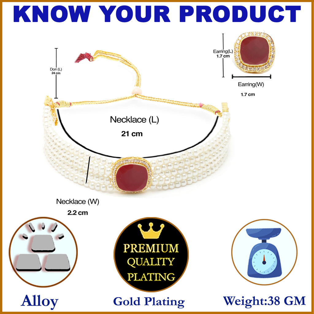Red and White AD Studded Gold-Plated Choker with White Pearl Necklace Set has a drawstring closure. A pair of matching red and white Studded studs, secured with a post and back closure.