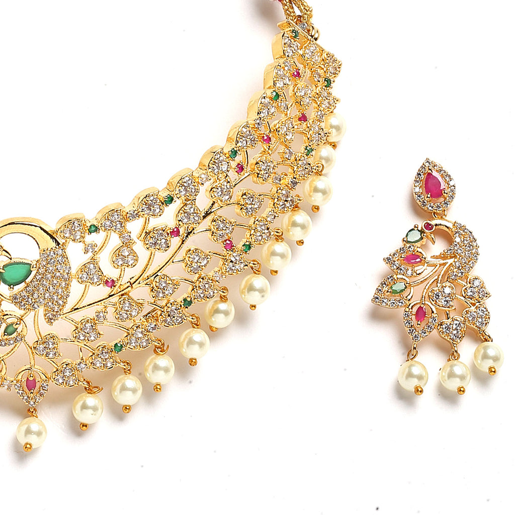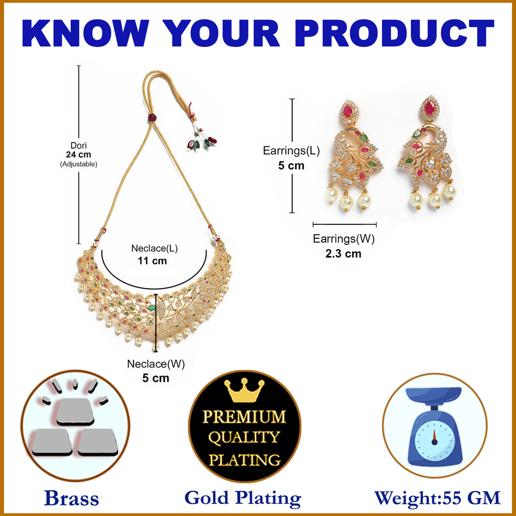 This jewellery set consists of a necklace and a pair of earrings. Gold-Plated White, Red and Green American Diamond-studded and beaded handcrafted necklace, has intricate work detailing, secured with a drawstring closure. A pair of matching drop earrings, each secured with post and back closure.