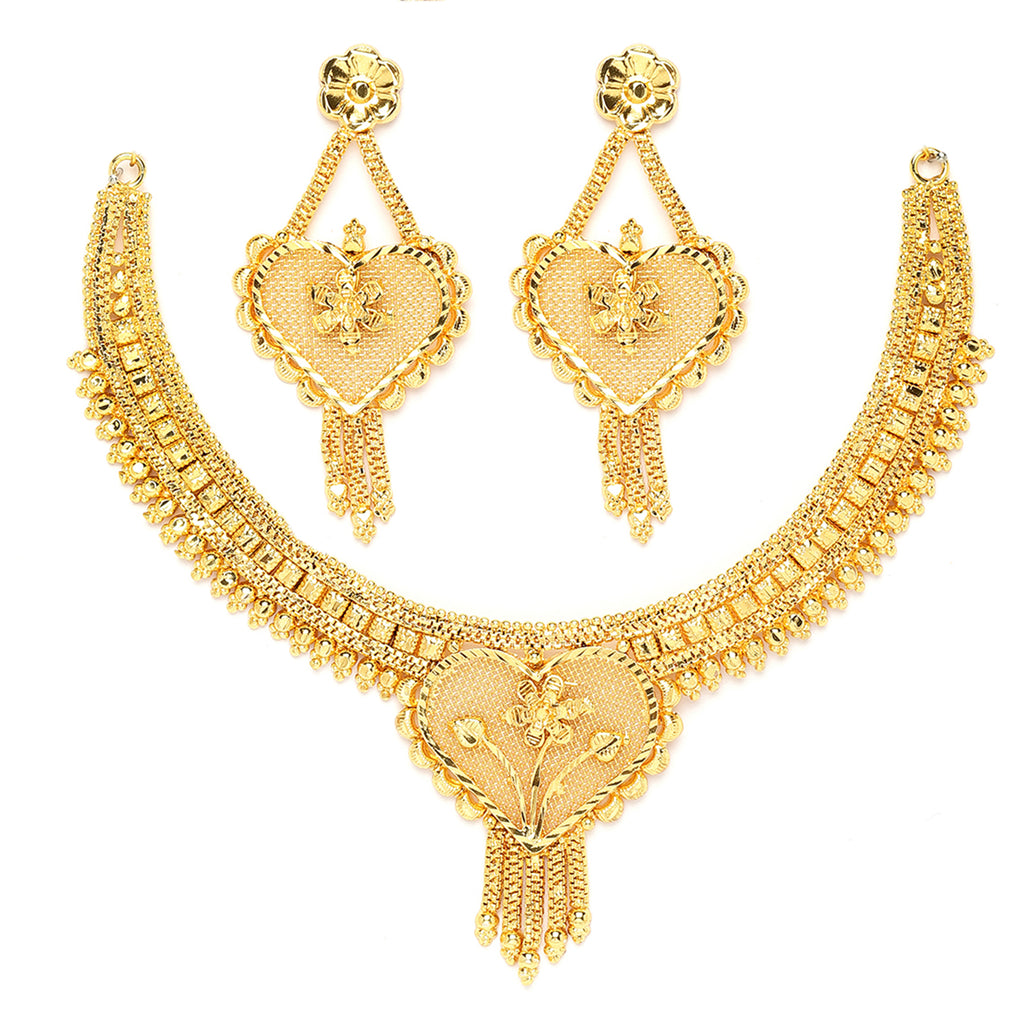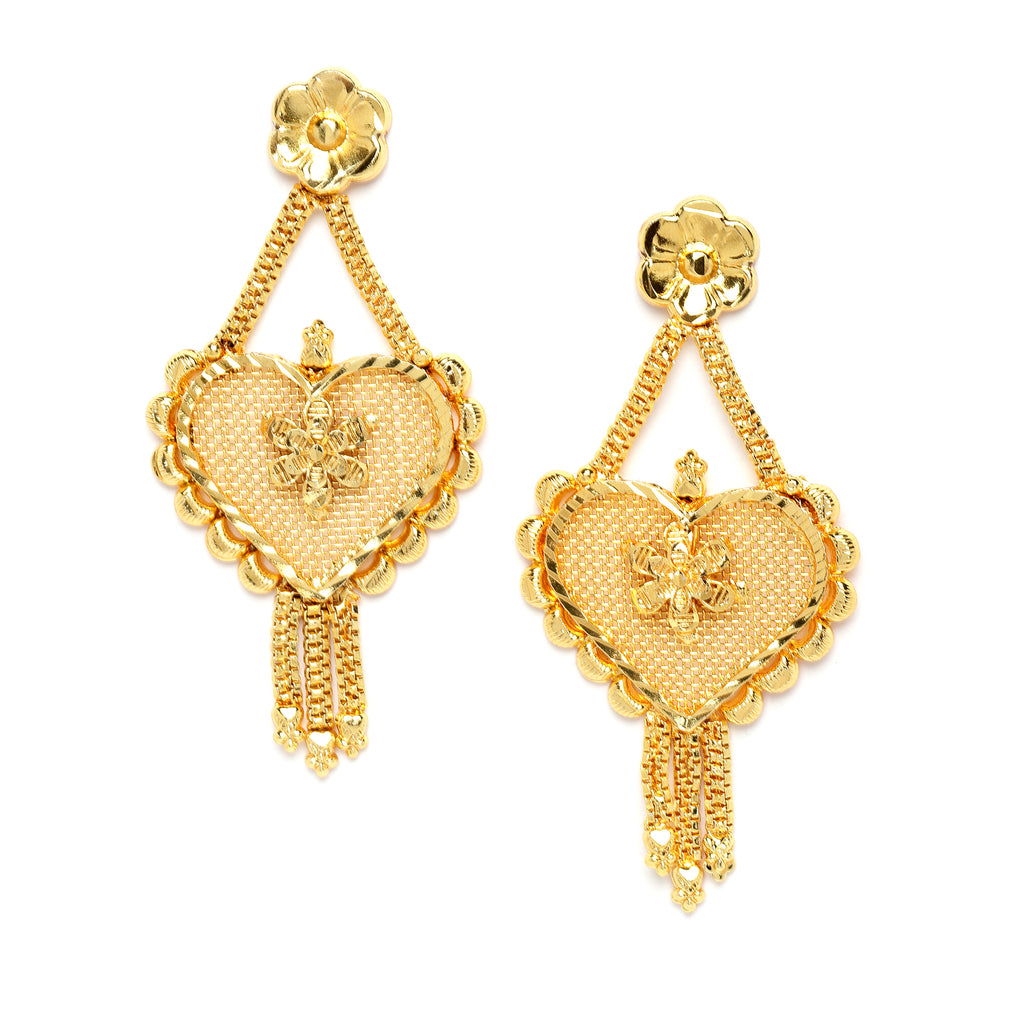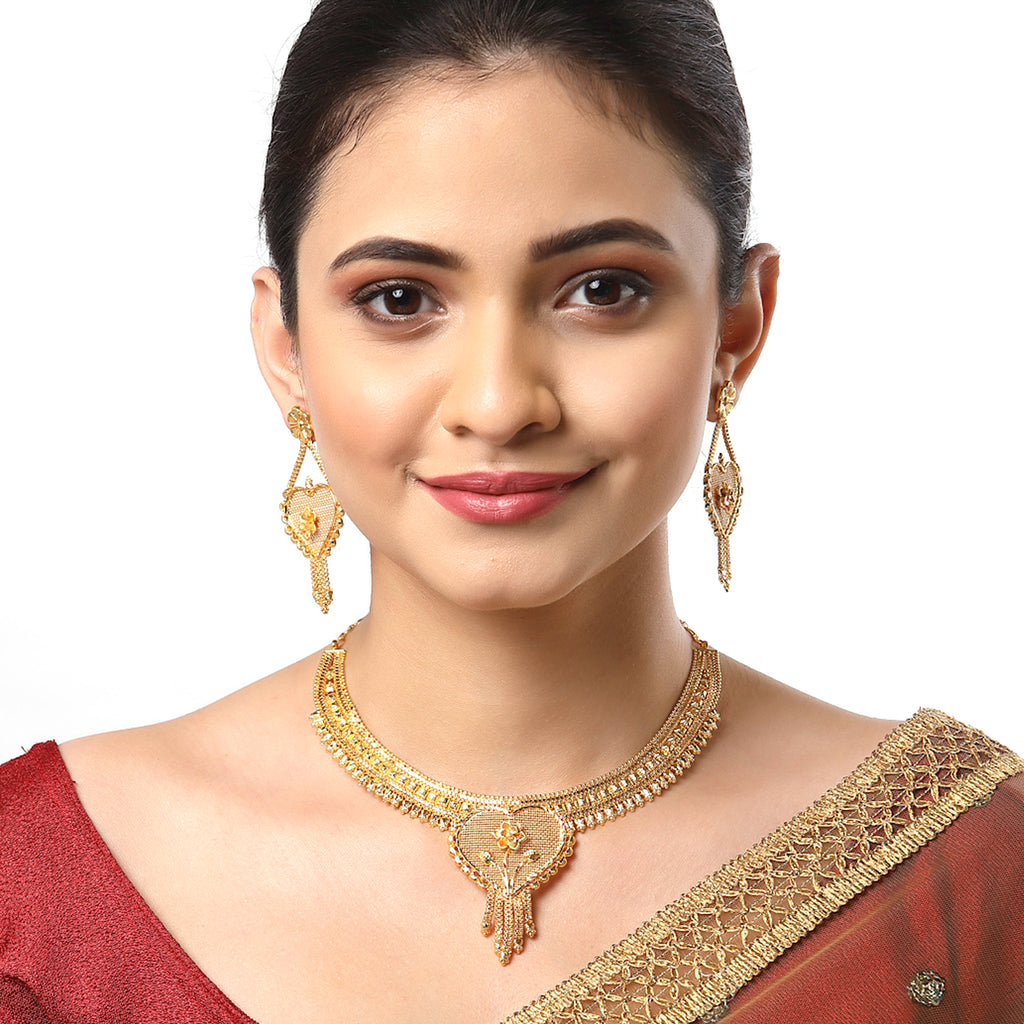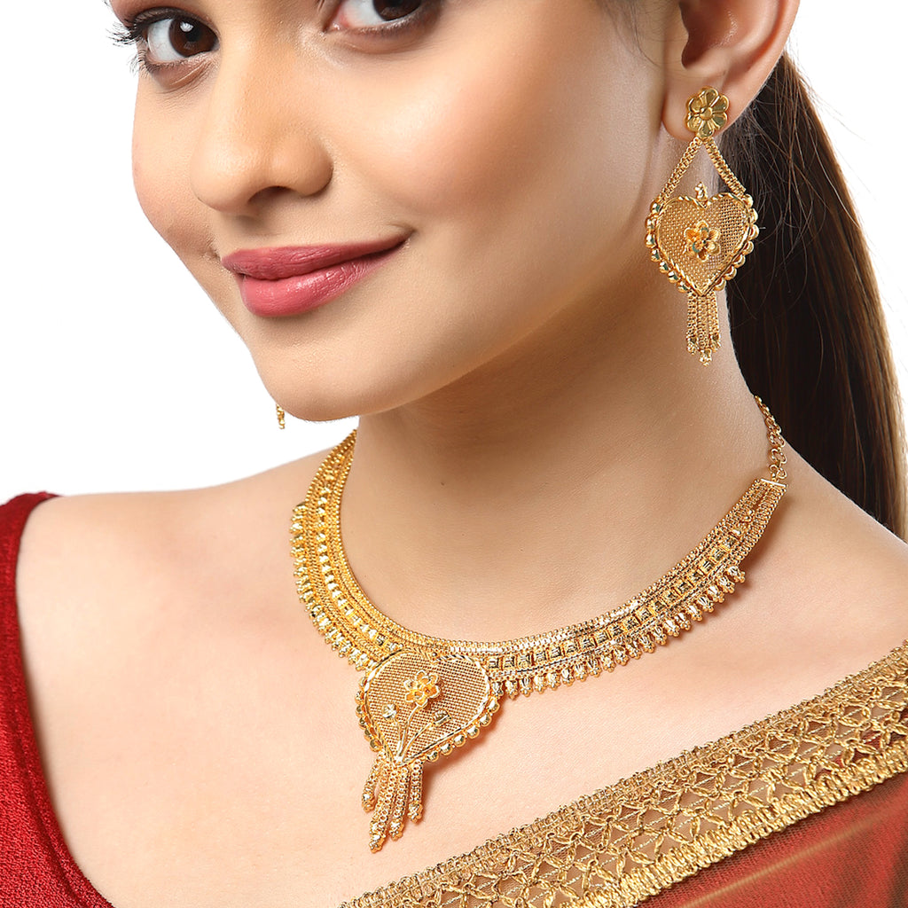 Gold-Plated tasseled necklace, having intricate details, secure with S-Hook closure. A pair of matching drop earrings, each secured with post and back closure.
