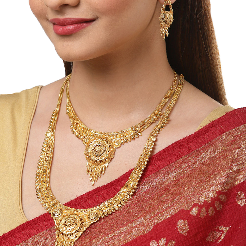 This jewellery set consists of a short necklace, long necklace and a pair of earrings. Gold-Plated short necklace, has textured detail, secured with a S-Hook closure. Gold-Plated long necklace, has textured details, secured with a S-Hook closure. A pair of matching earrings, each secured with a post and back closure.