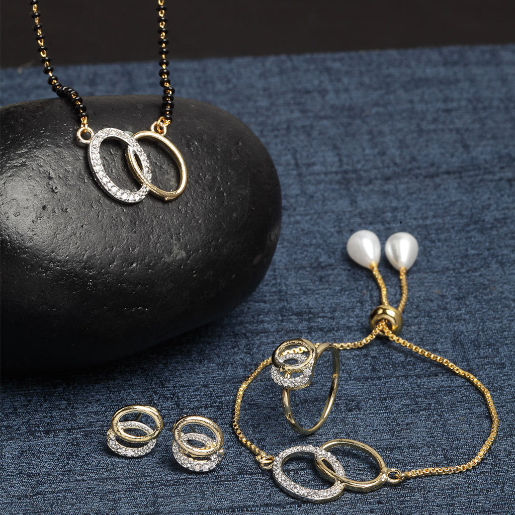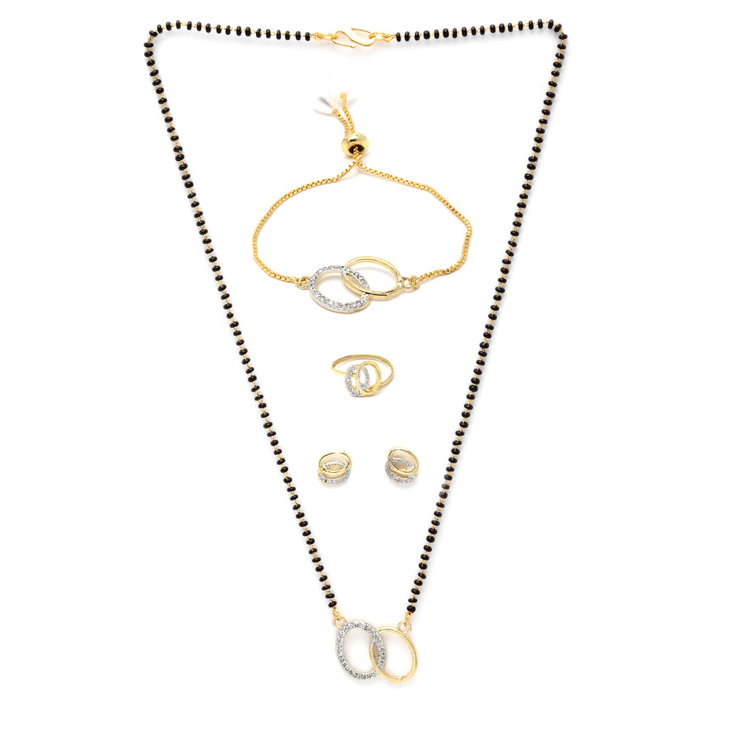 This jewellery set consists of a mangalsutra, a pair of earrings, a bracelet and rings. Gold-Plated mangalsutra has white AD-studded & black beaded pendant, secured with S-Hook closure. A pair of matching earrings, secured with a post-and-back closure. A matching bracelet, secured with an adjustable closure. A matching finger ring, secured with slip-on closure.
