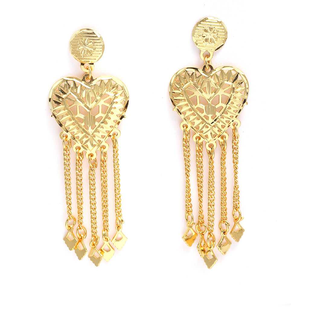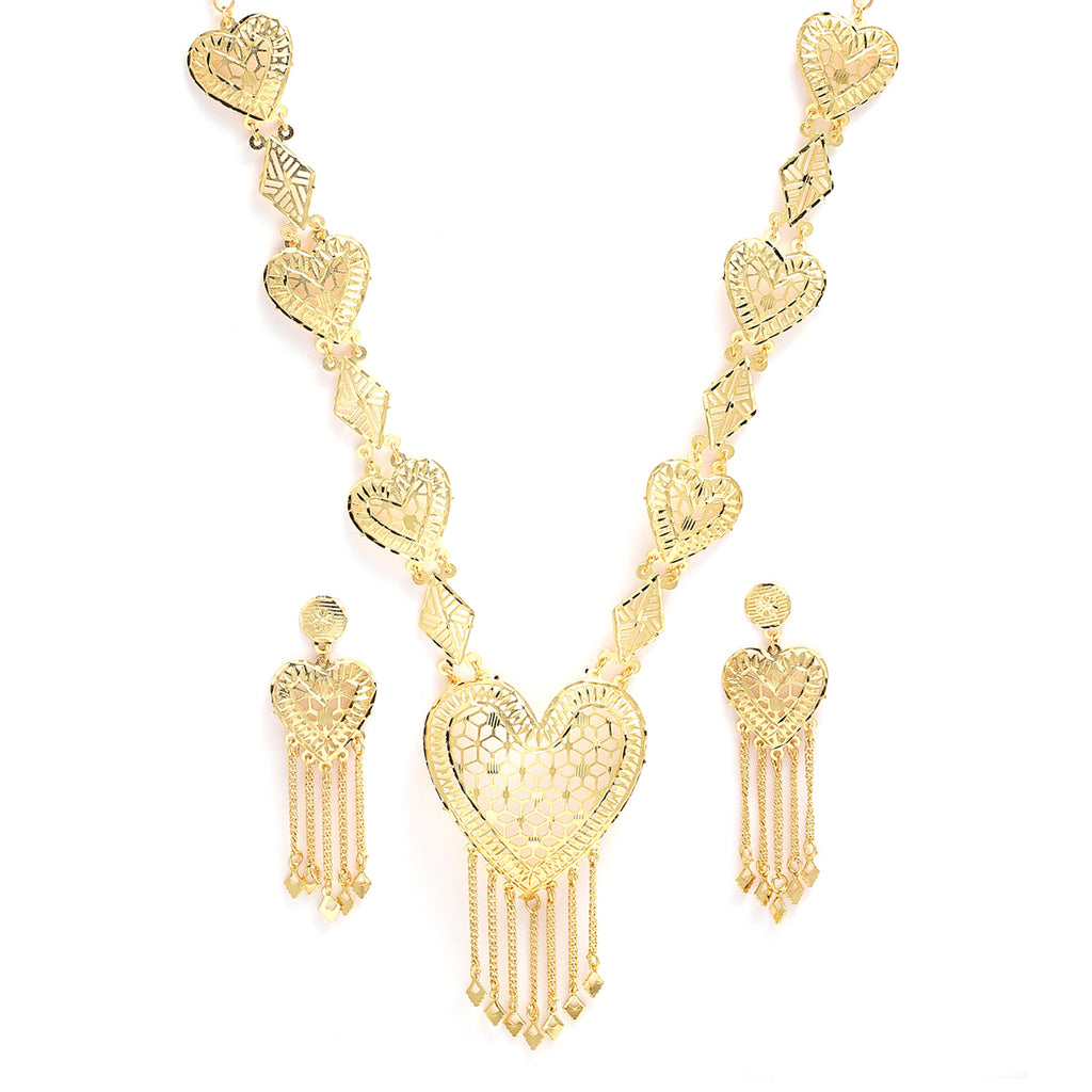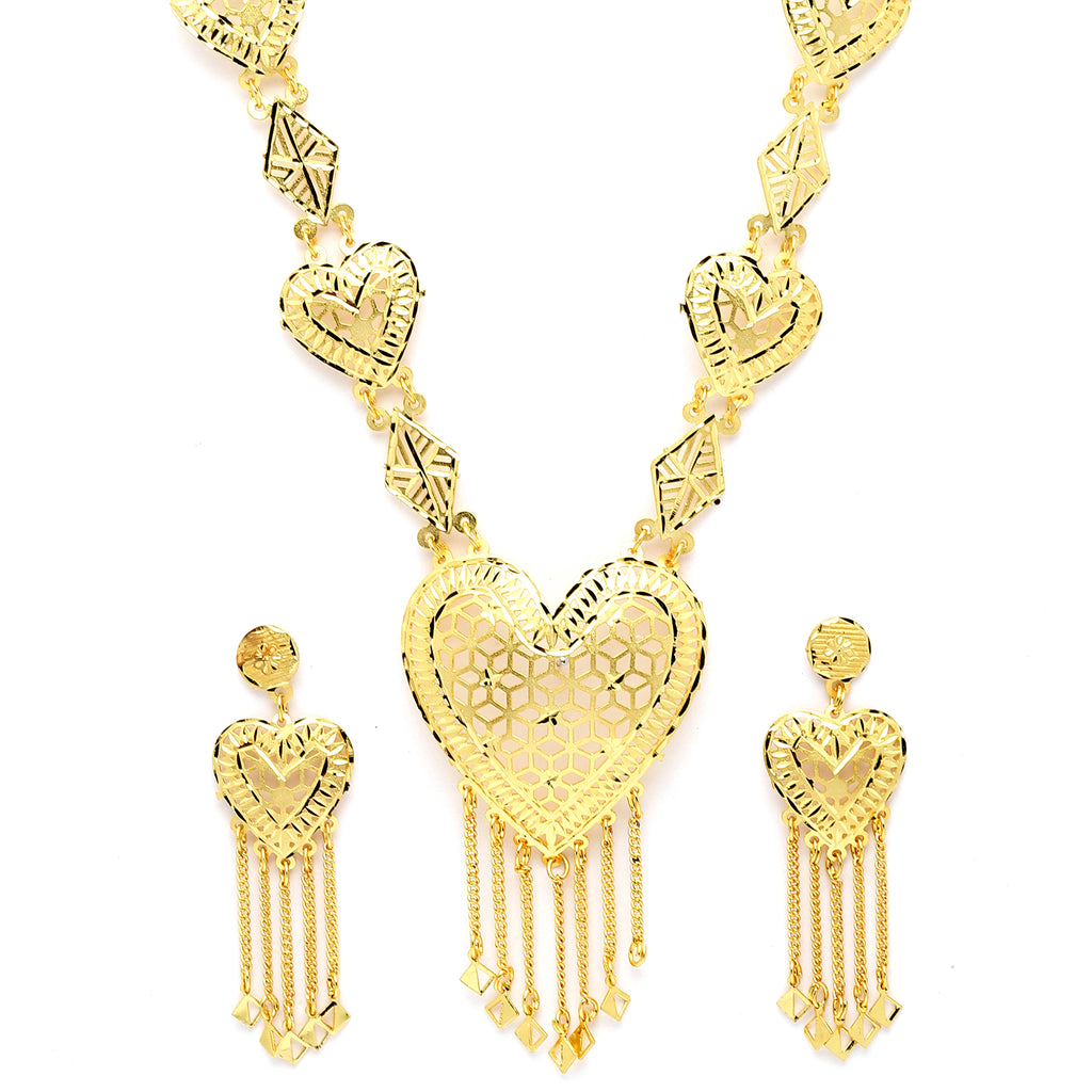 This jewellery set consists of a pair of Earrings, A Long Necklace, A Bracelet & A Ring Gold Tone Gold-Plated Heart Shaped Necklace, Secured with S-Hook closure. A Pair Of Matching Heart Shaped Earring, Secured With Post & Back Closure. A Pair Of Matching Heart Shaped Ring.
