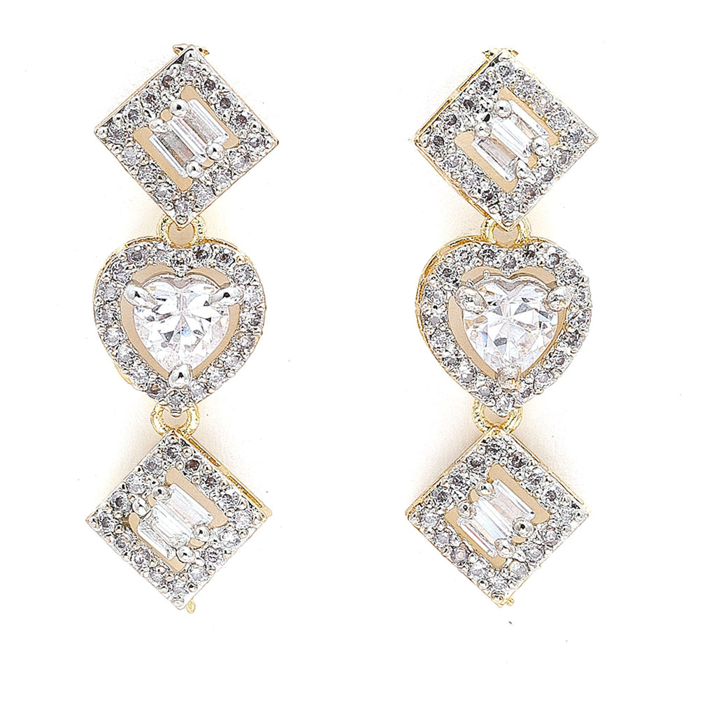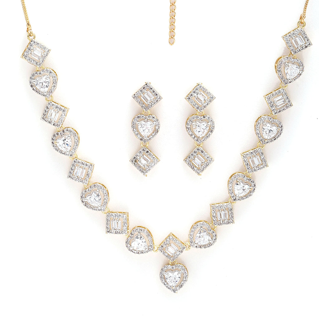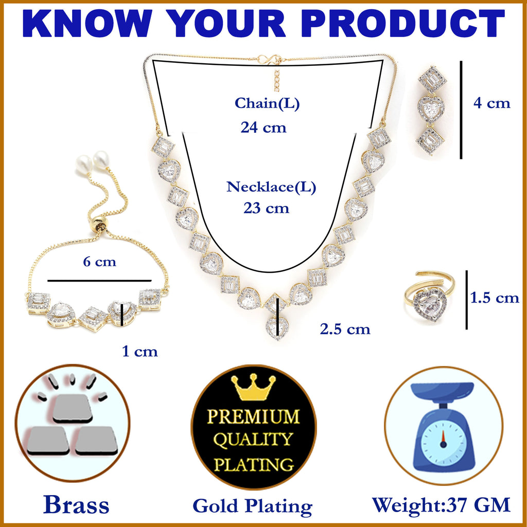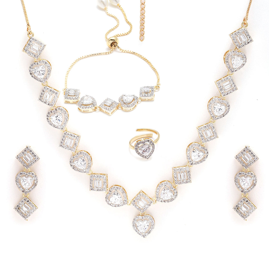This Heart Shaped jewellery set consists of a pair of earrings, a pendant, a bracelet and a ring. Silver-Toned Gold-Plated Heart & Square Shaped American Diamond studded necklace, secured with a S-Hook closure. A pair of matching Heart & Square Shaped drop earrings, secured with a Post and Back closure. A matching Heart & Square Shaped adjustable ring, secured with a Lever Back closure. A matching Heart & Square Shaped adjustable Bracelet, secured with a Drawstring closure.