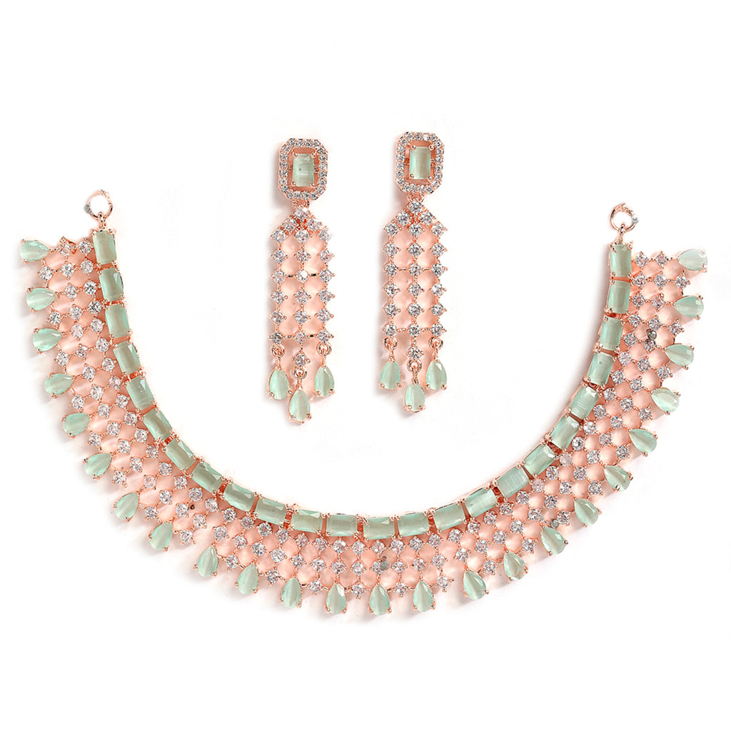 This jewellery set consists of a necklace, a pair of earrings. Rose Gold-Plated White and Green AD stone studded necklace secured with a S-Hook closure. A matching pair of earrings that is also Rose Gold-Plated and AD stone studded, each secured with a post-and-back closure