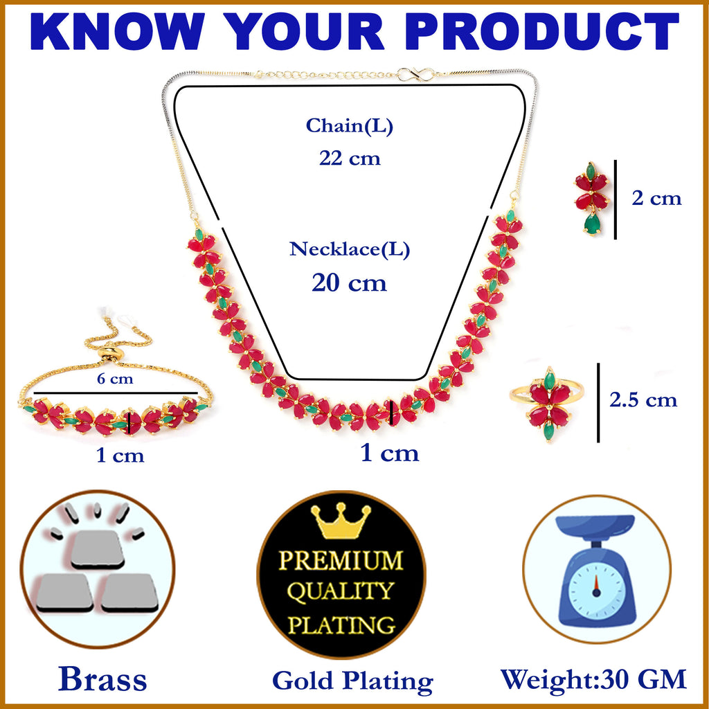 This 18K Gold-Plated handcrafted jewellery set consists of a pair of earrings, a necklace, a bracelet and a ring. Green and Red flower shaped 18K Gold-Plated American Diamond studded necklace, secured with a S-Hook closure. A matching pair of gold-plated Green and Red flower shaped drop earrings, secured with a post-and-back closure. A matching 18K Gold-Plated Green and Red flower shaped bracelet, secured with a drawstring closure. A matching 18K Gold-Plated Green and Red flower shaped adjustable ring.