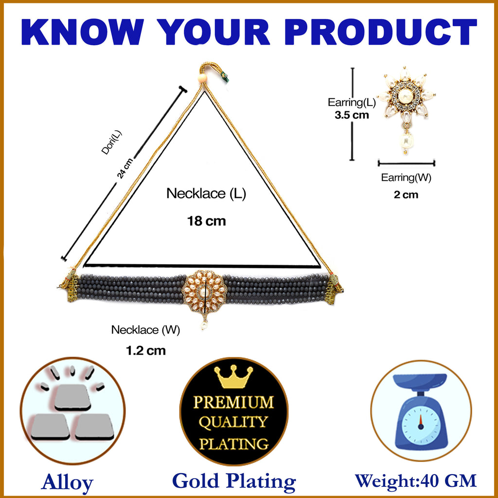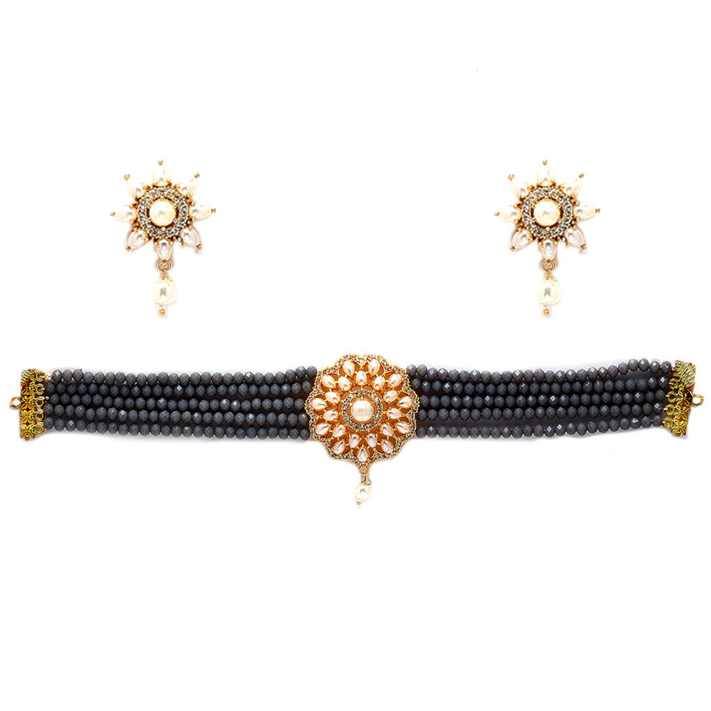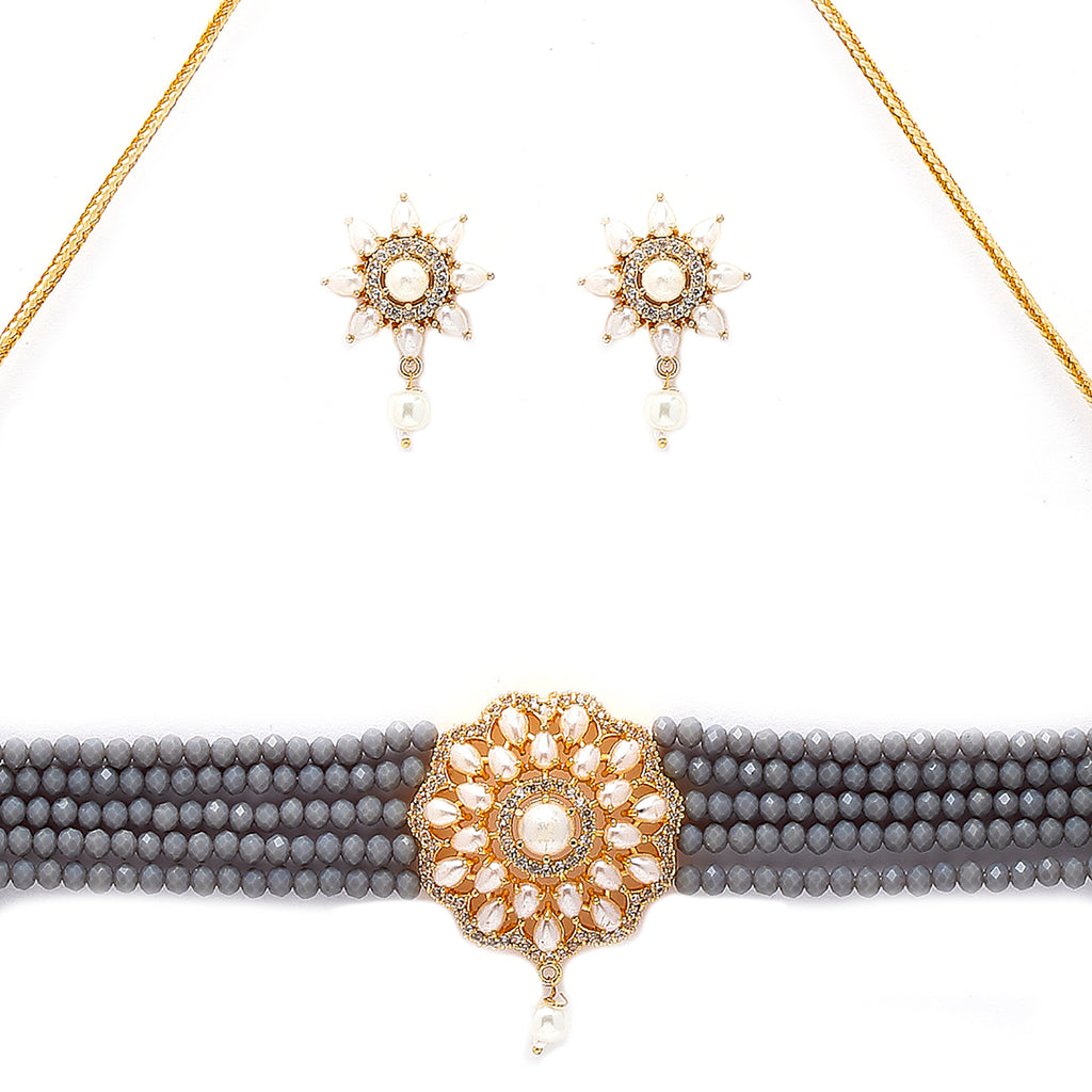 Grey Gold-plated Kundan Studded & Beaded Multistrand Choker Necklace Jewellery Set