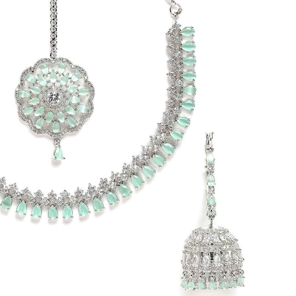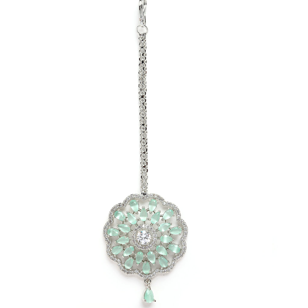 Sea Green & Silver-Toned Green AD Stone-studded Jewellery Set with Mang Tika