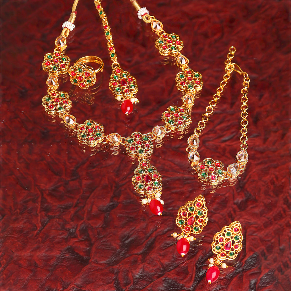 Red Gold-Plated Green Kundan Studded Floral Jewellery Set