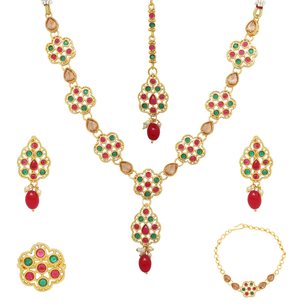 This jewellery set consists of a necklace, earrings, finger ring, bracelet & mang tika. Gold-Plated colorful floral pendant, has kundan-studded detail, comes with a chain, secured with a S-Hook closure. A pair of matching Gold-Plated colorful kundan studded stud earrings, secured with a post and back closure. Gold-Plated adjustable finger ring, has kundan studded detail secured with lever back closure. Gold-Plated kundan studded floral bracelet, secured with S-Hook closure. Gold-Plated kundan studded floral mang tika, secured with hook closure.
