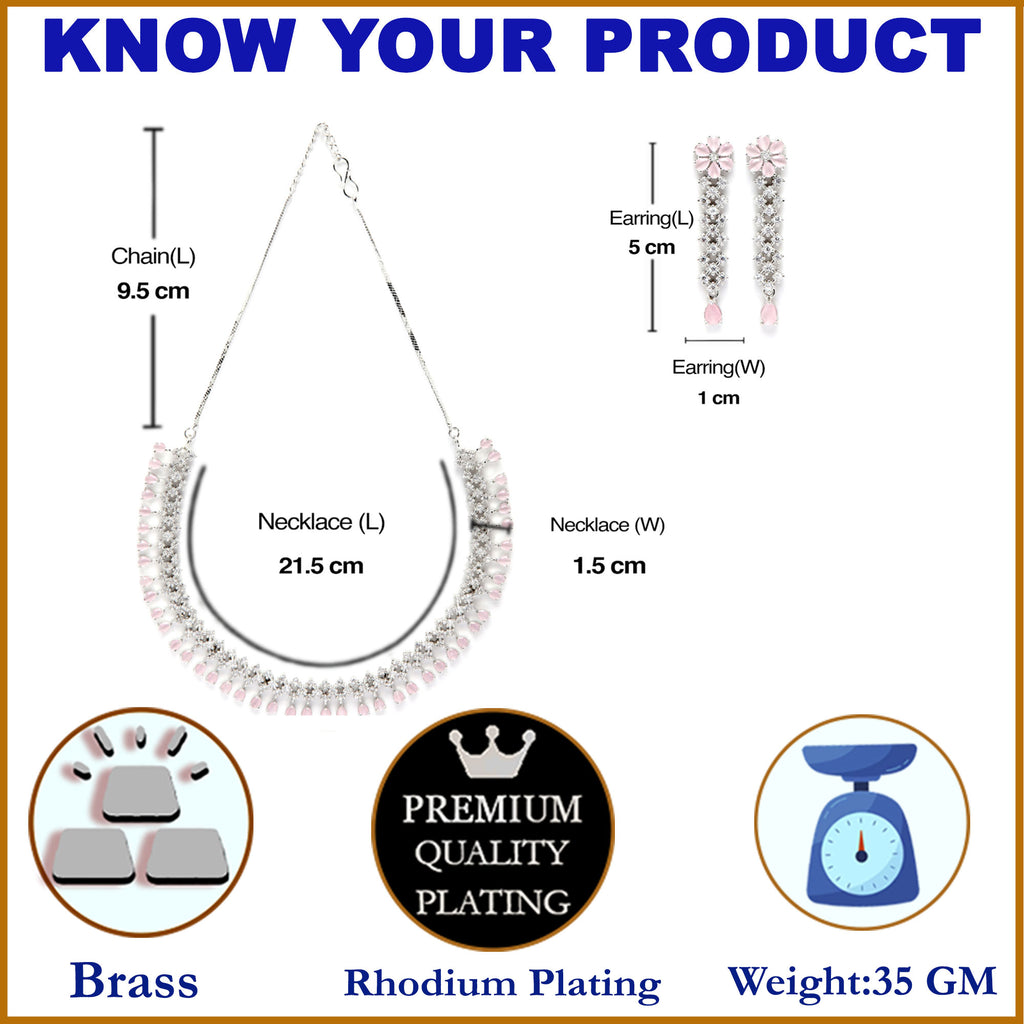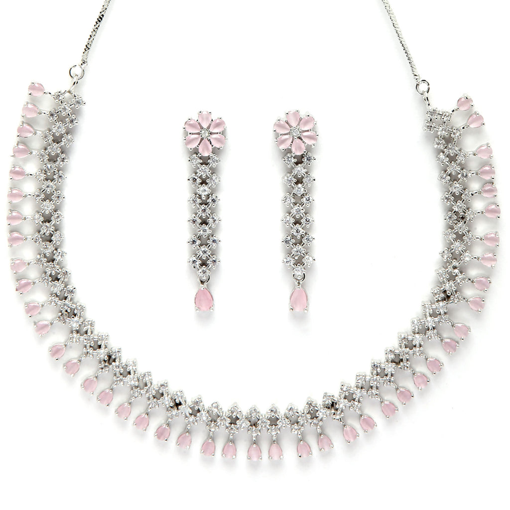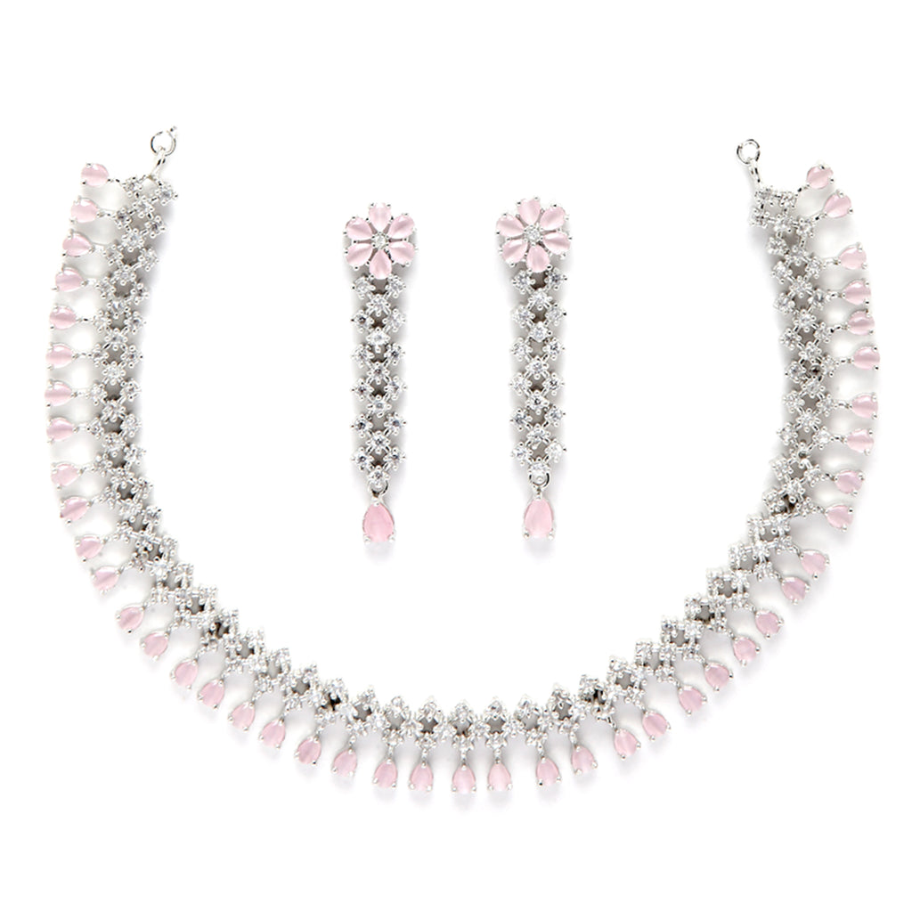 This jewellery set consists of a necklace and a pair of earrings. Rhodium-Plated with Silver-Tone necklace, has pink American Diamond-studded detail, secured with a S-Hook closure comes with a pair of matching earrings, each secured with a post and back closure.
