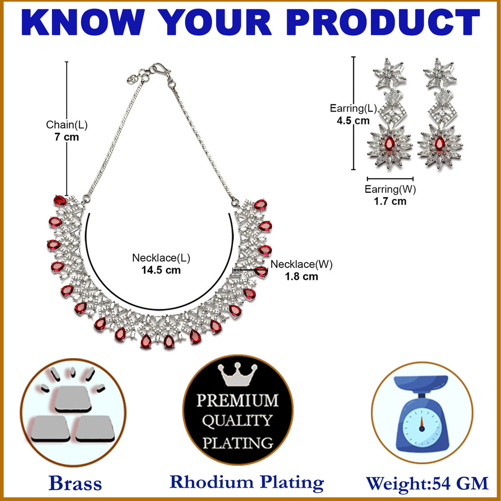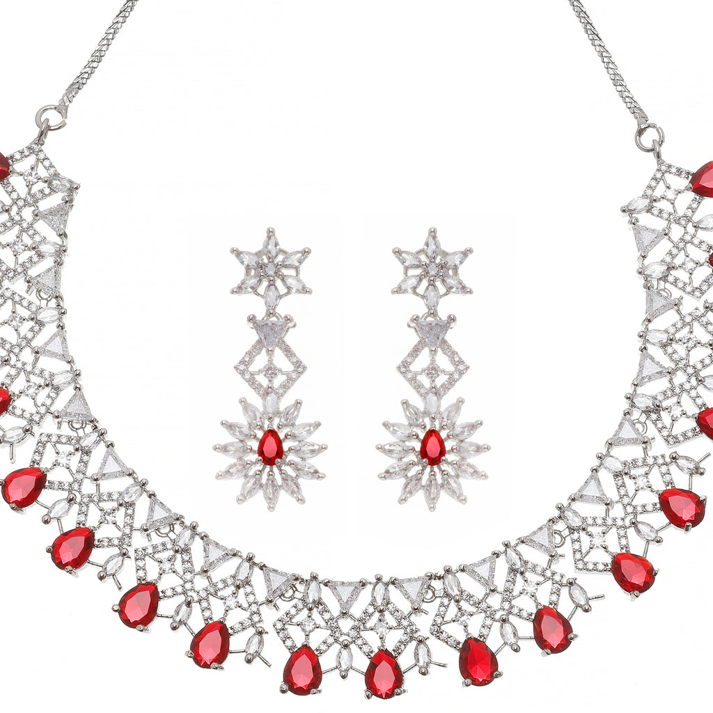 Rhodium-Plated Red & White Dribble Shape American Diamonds Studded Necklace & Earrings Jewellery Set