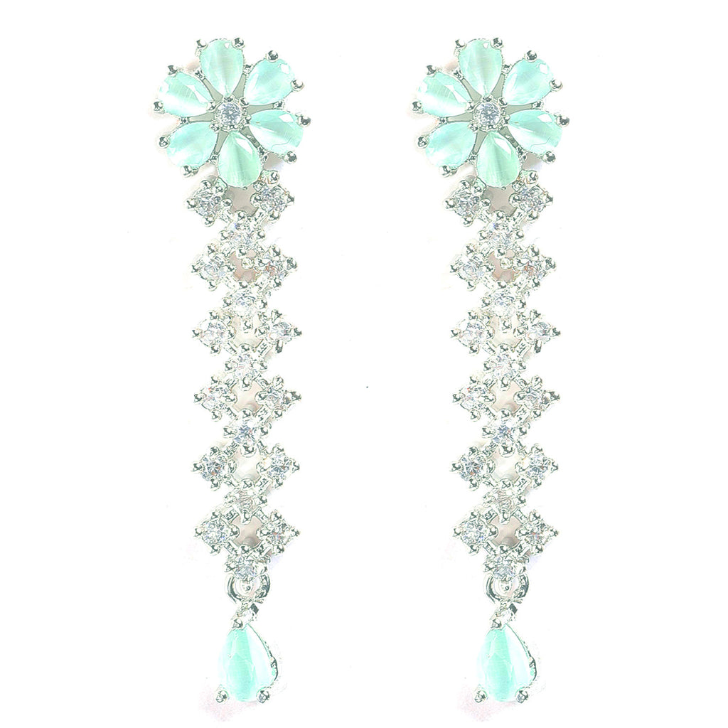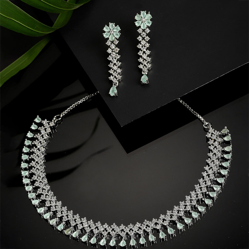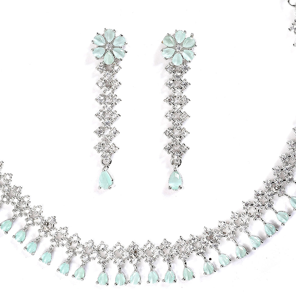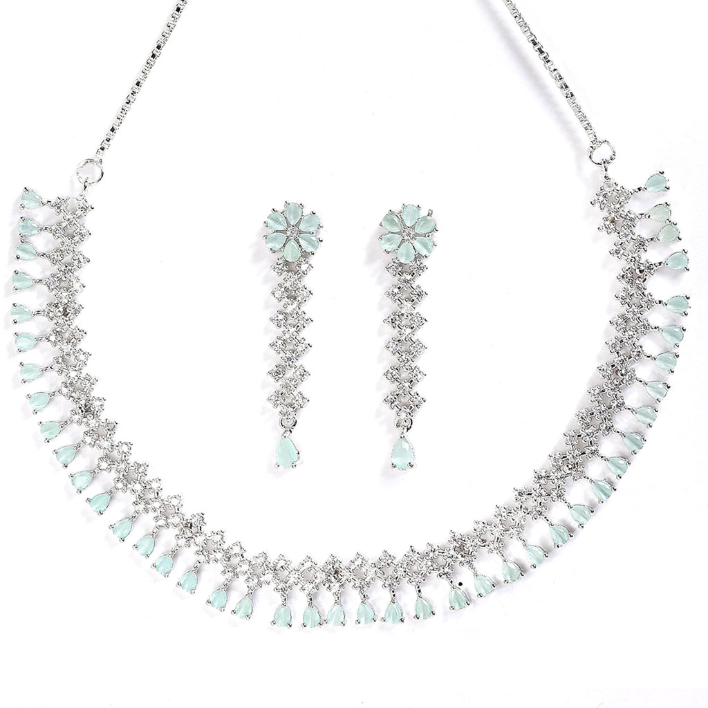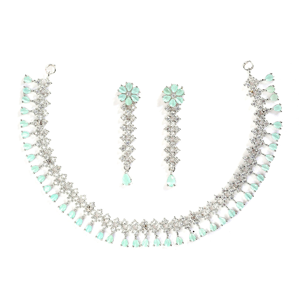 Rhodium-Plated Sea Green AD-Studded Flower Design Jewellery Set