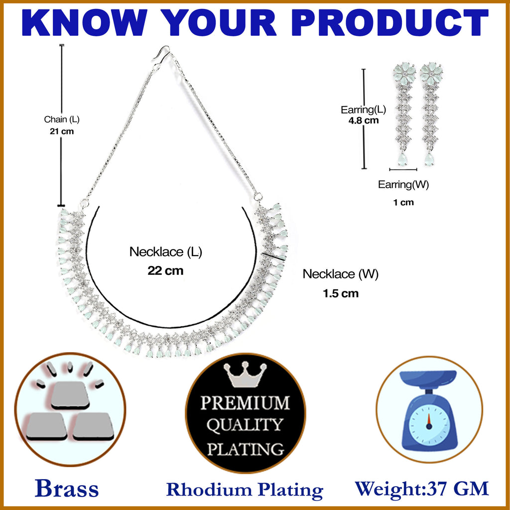 This jewellery set consists of a necklace and a pair of earrings. Rhodium-Plated necklace sea-green AD-studded, secured with a fish-hook fastening. A pair of matching earrings, secured with a post-and-back closure.