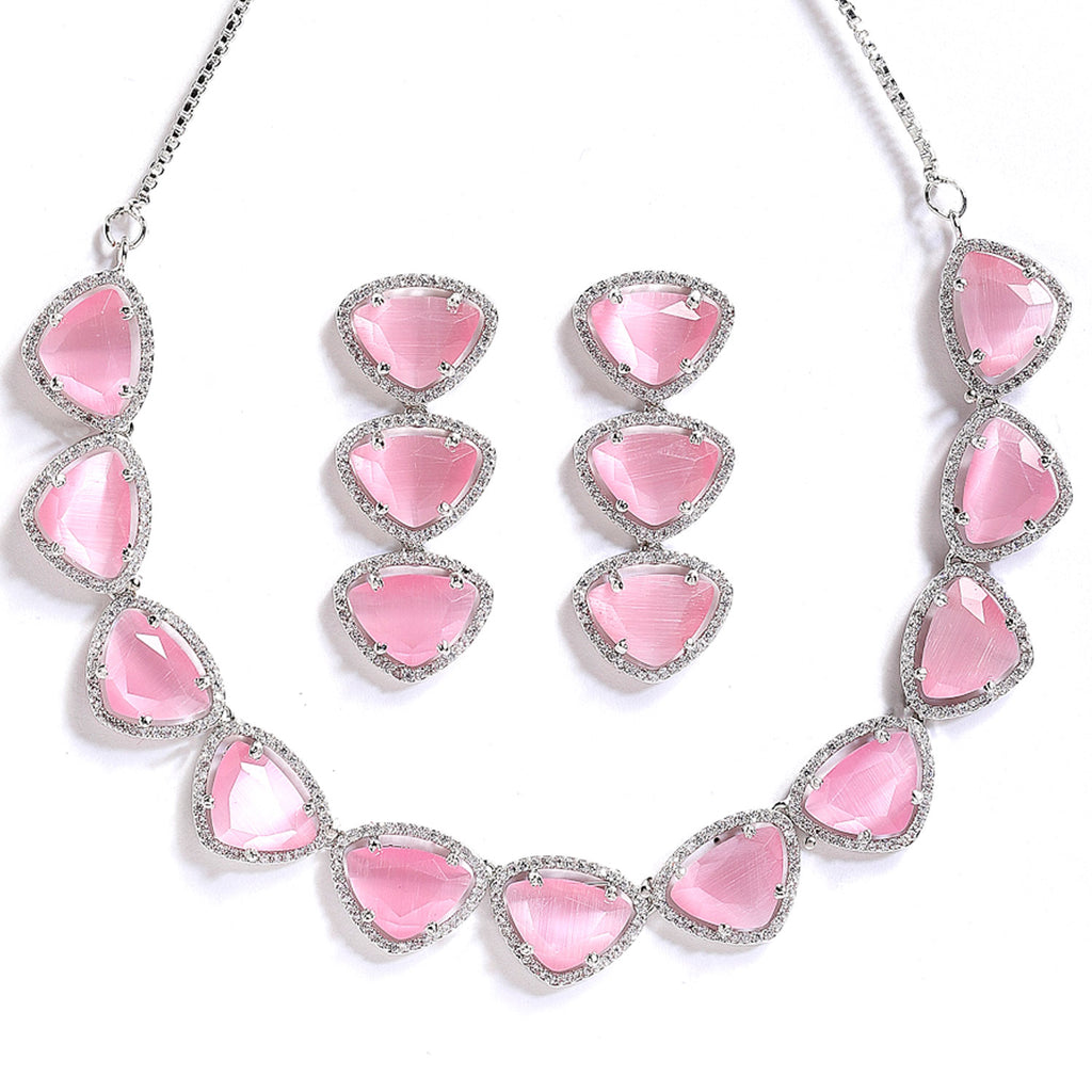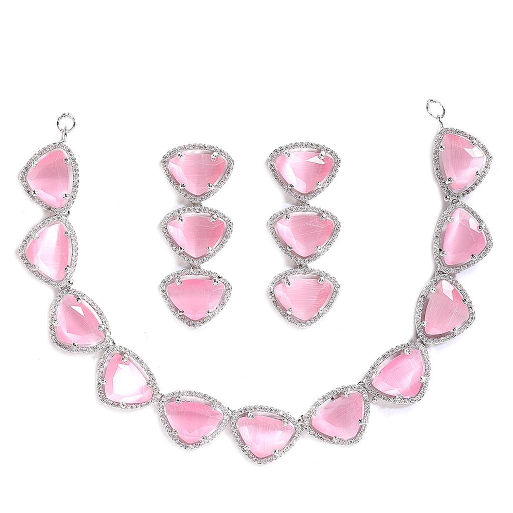 This jewellery set consists of a necklace and a pair of earrings. Rhodium-Plated necklace, has silver and pink American Diamond-studded detail, secured with a S-Hook closure. Comes with a pair of matching earrings, each secured with a post and back closure.
