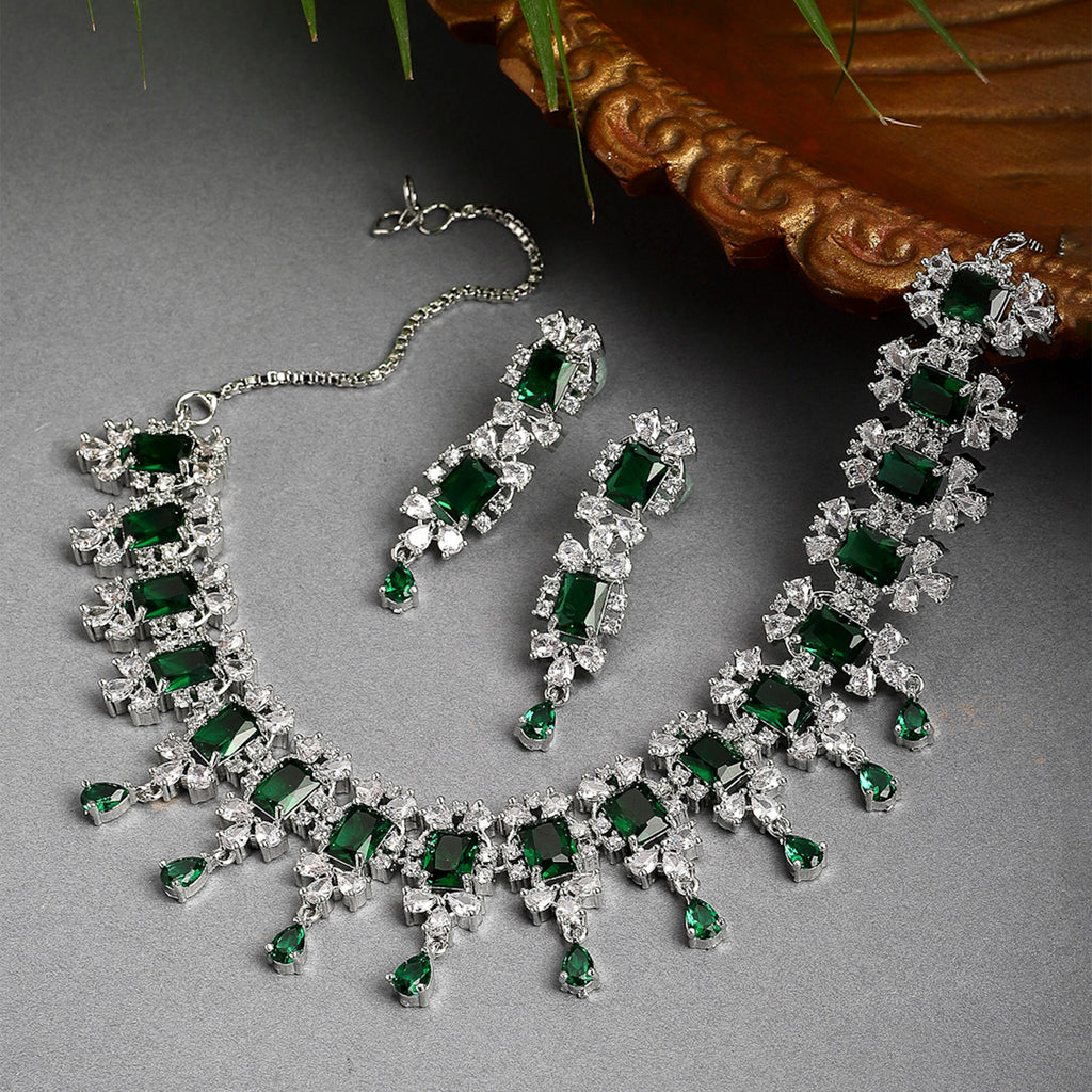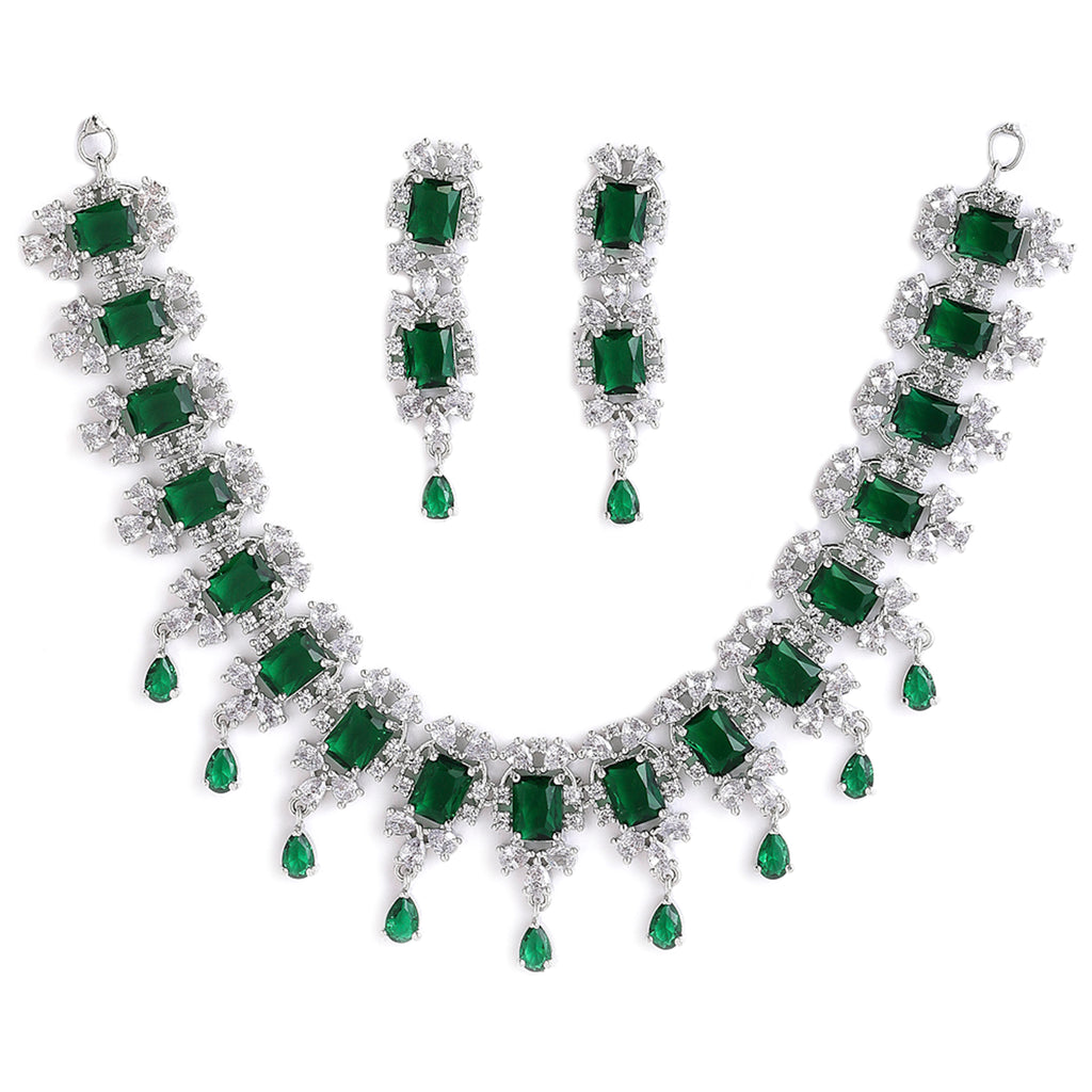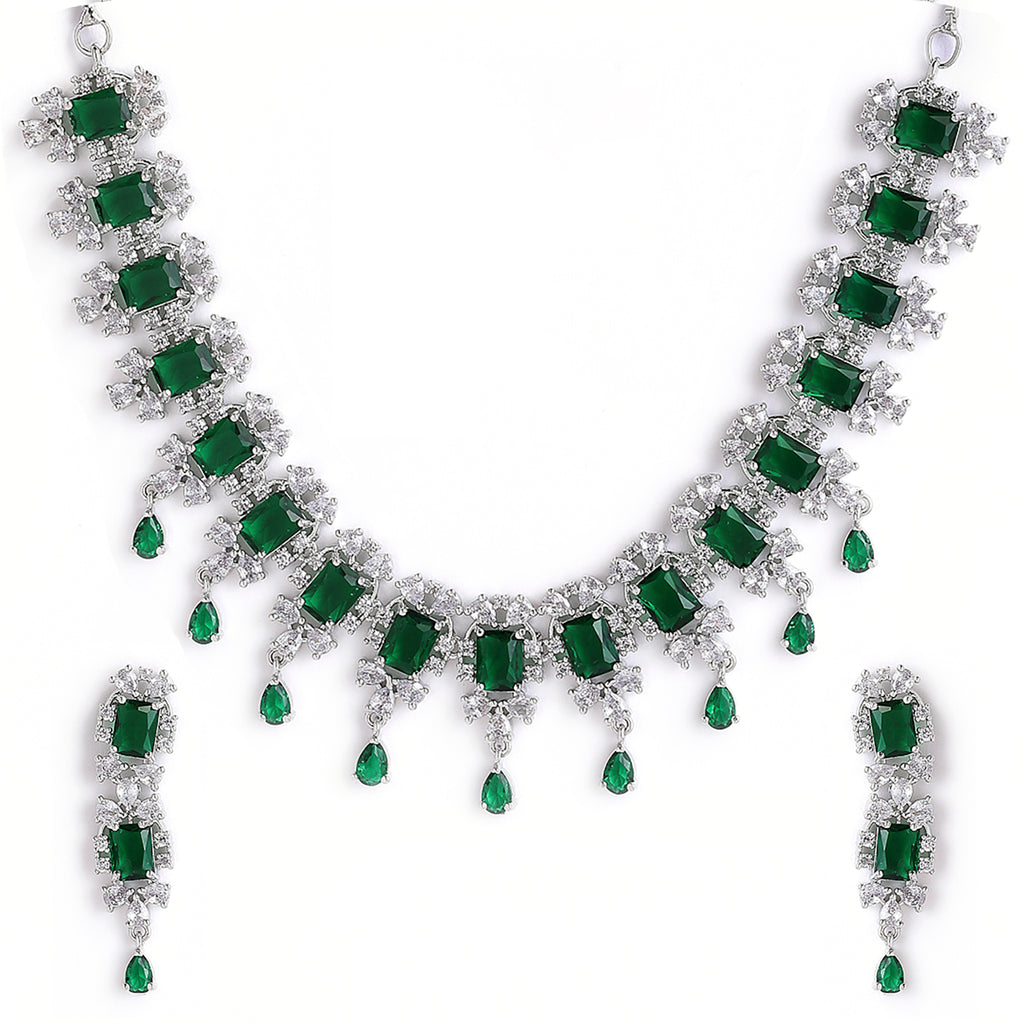 This jewellery set consists of a necklace and a pair of earrings. Rhodium-Plated necklace green and white American Diamond-studded, secured with a fish-hook fastening. A pair of matching earrings, secured with a post and back closure.