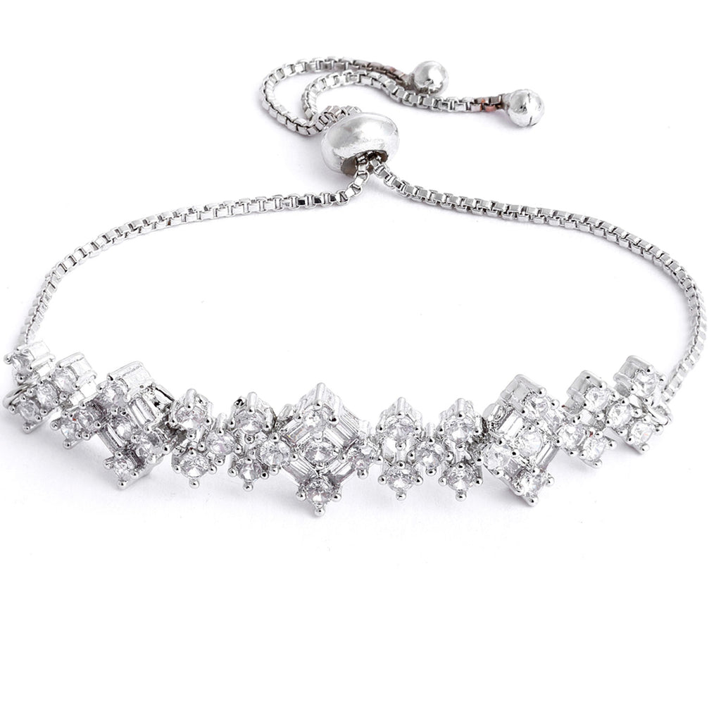 This jewellery set consists of a necklace, a pair of earrings, bracelet and a ring. Rhodium-Plated with Silver-Toned necklace, has white AD studded design secured with an a hook closure. A pair of matching drop earrings, secured with a post and back closure. A matching bracelet with a drawstring closure. A matching adjustable finger ring.