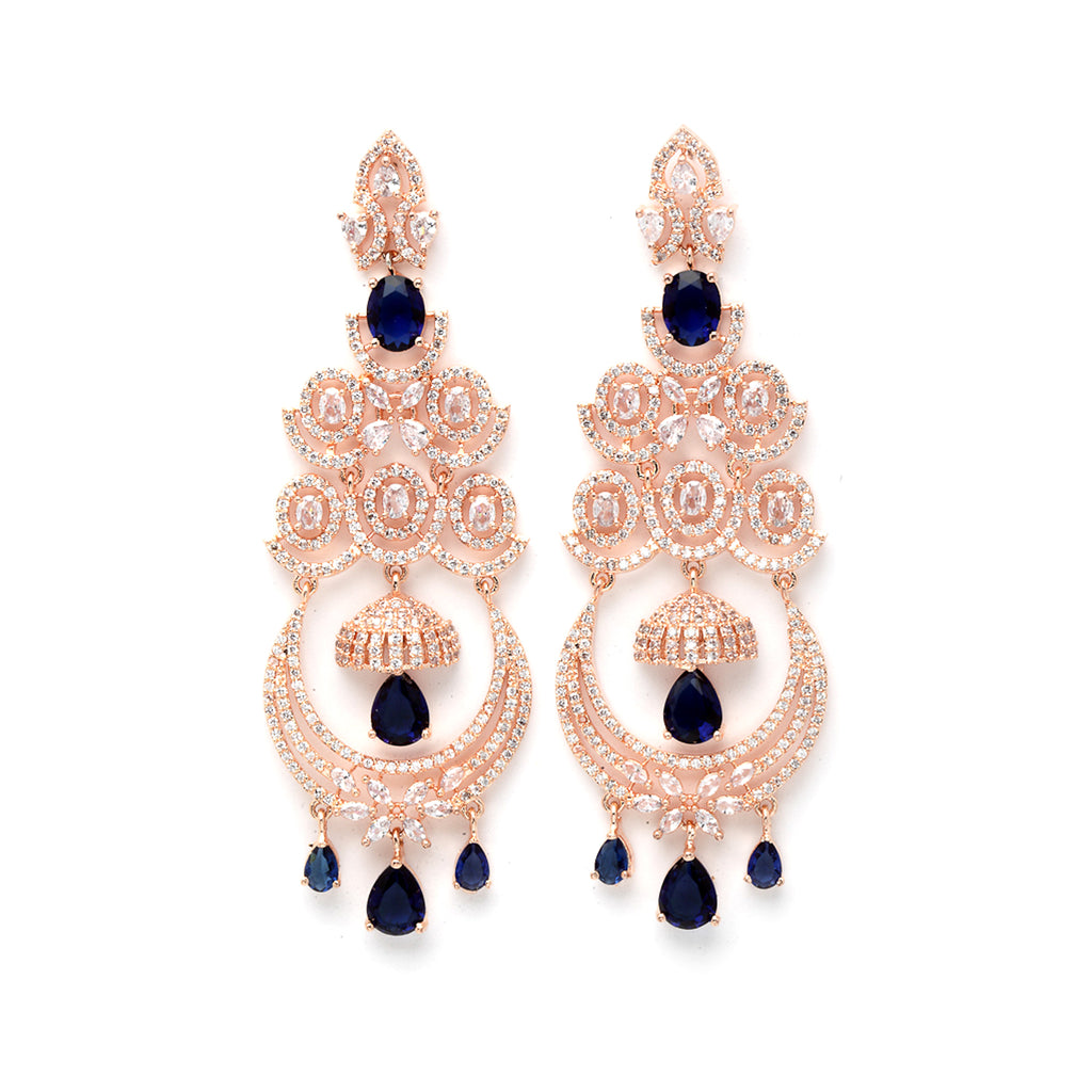 Navy Blue American Diamond with Rose Gold-Plated Contemporary Chandbalis Earrings