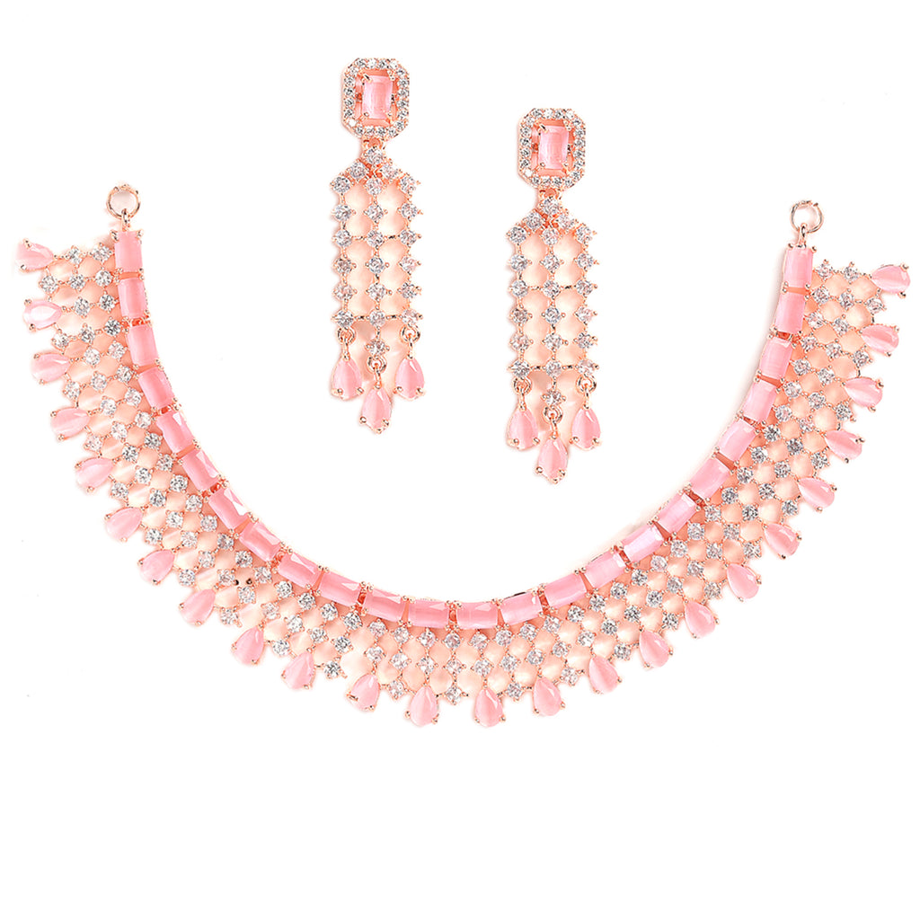 This jewellery set consists of a necklace, a pair of earrings. Rose gold-plated contemporary necklace has pink and white AD-studded intricate detail secured with a hook closure. A pair of matching drop earrings, each secured with a post-and-back closure.