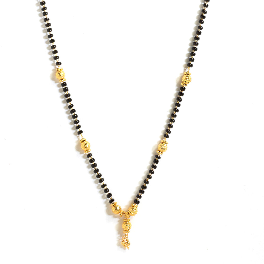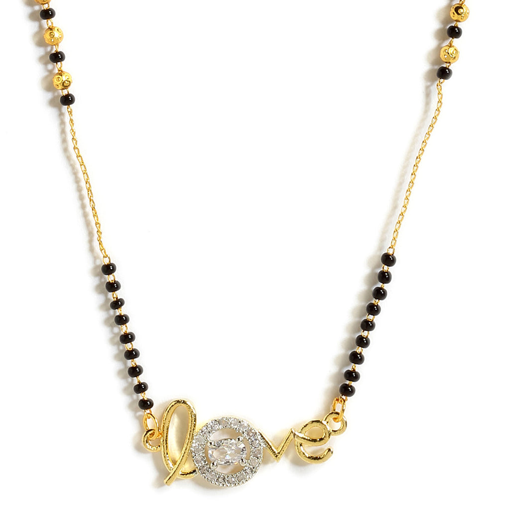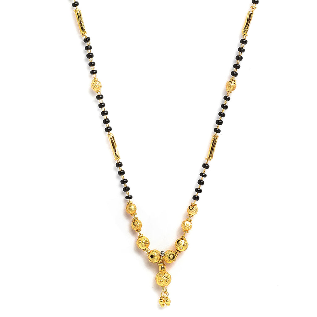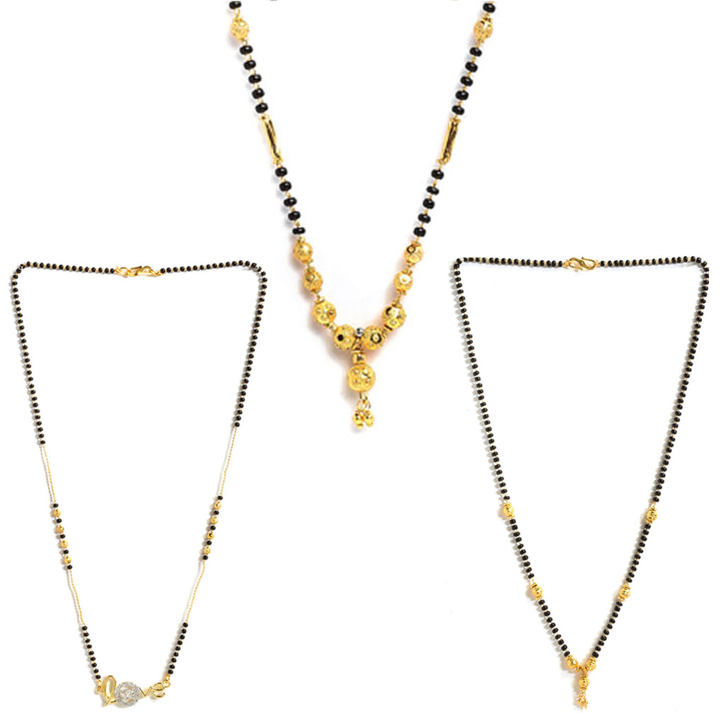 Set of three mangalsutras. Two Gold-Plated black beaded mangalsutras has a spherical design centerpiece, secured with an S-Hook closure. Gold-Plated mangalsutra has a chain with black beaded detail, AD-studded Love and Heart Pendant centerpiece, secured with an S-Hook closure.