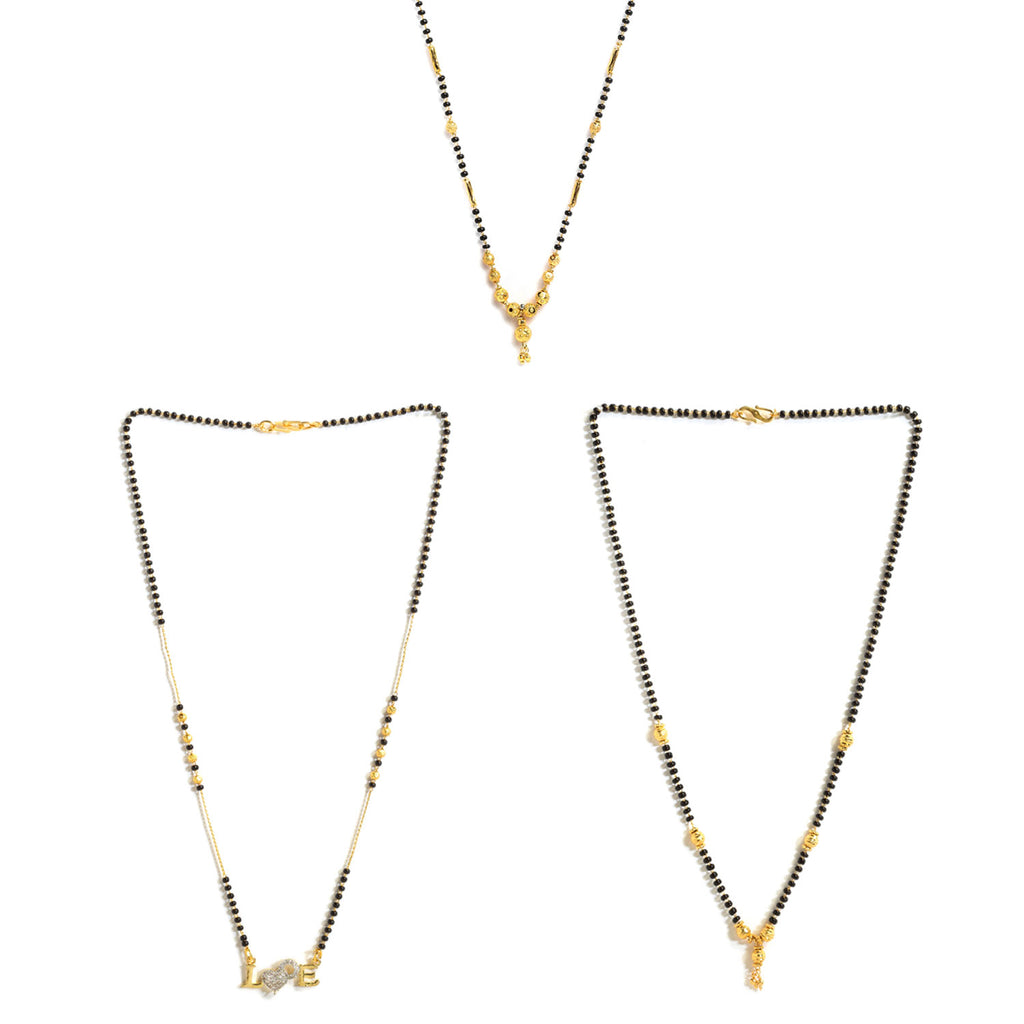 Set of three Gold-Plated AD-Studded black beaded mangalsutra. Two Gold-Plated black beaded mangalsutras has a spherical design centerpiece, secured with an S-Hook closure. Gold-Plated mangalsutra has a chain with black beaded detail, AD-studded Letter Love with embelished heart pendant centerpiece, secured with an S-Hook closure.