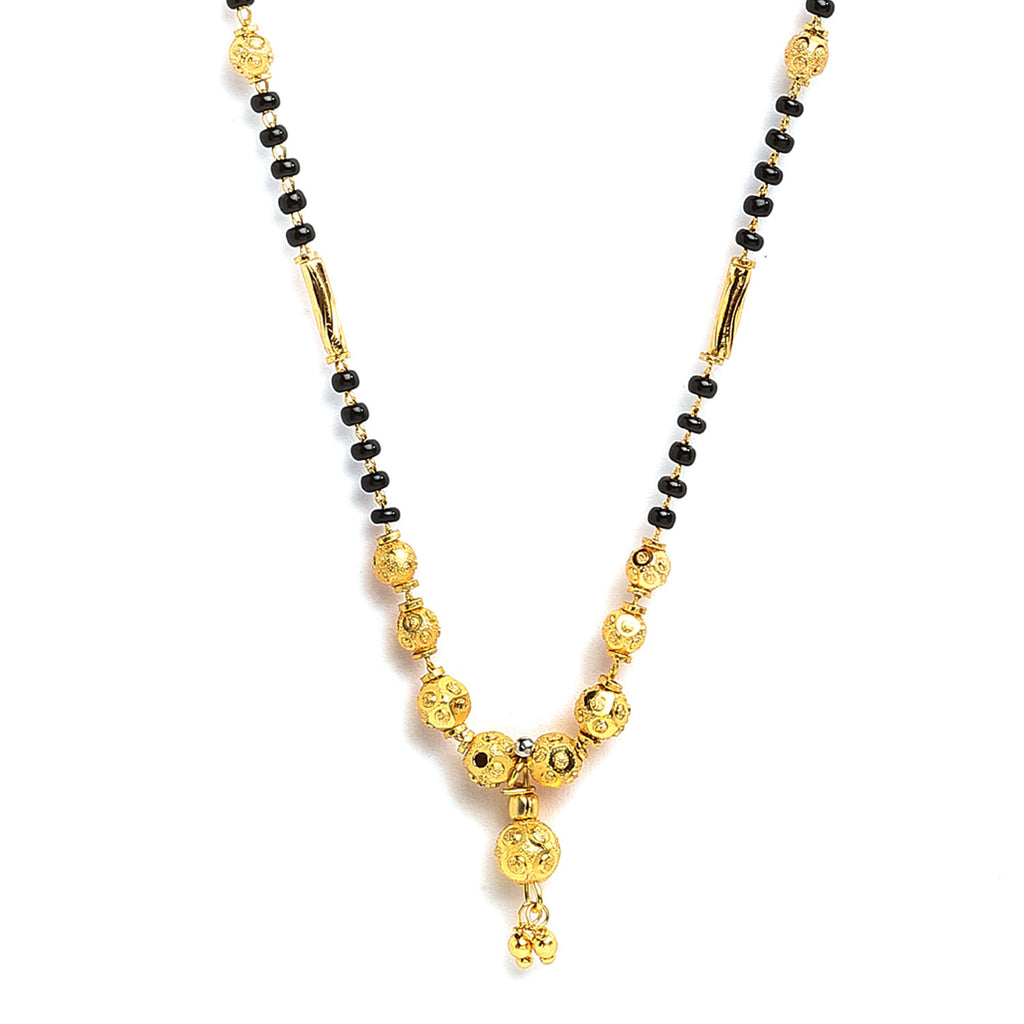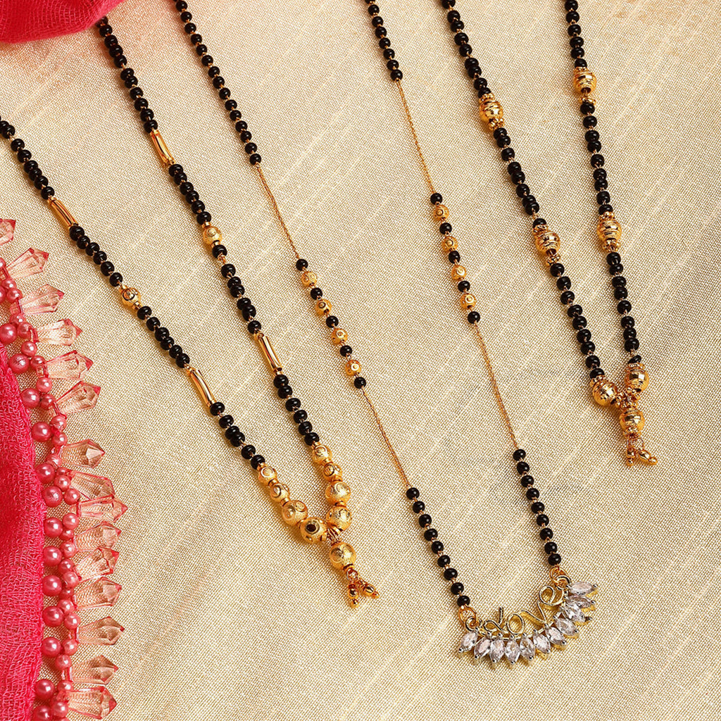 Set of three Gold-Plated American Diamond-studded black beaded mangalsutra. Two Gold-Plated black beaded mangalsutras has a spherical design centerpiece, secured with an S-Hook closure. Gold-Plated mangalsutra has a chain with black beaded detail, American Diamond-studded love and leaf pendant centerpiece, secured with an S-Hook closure.