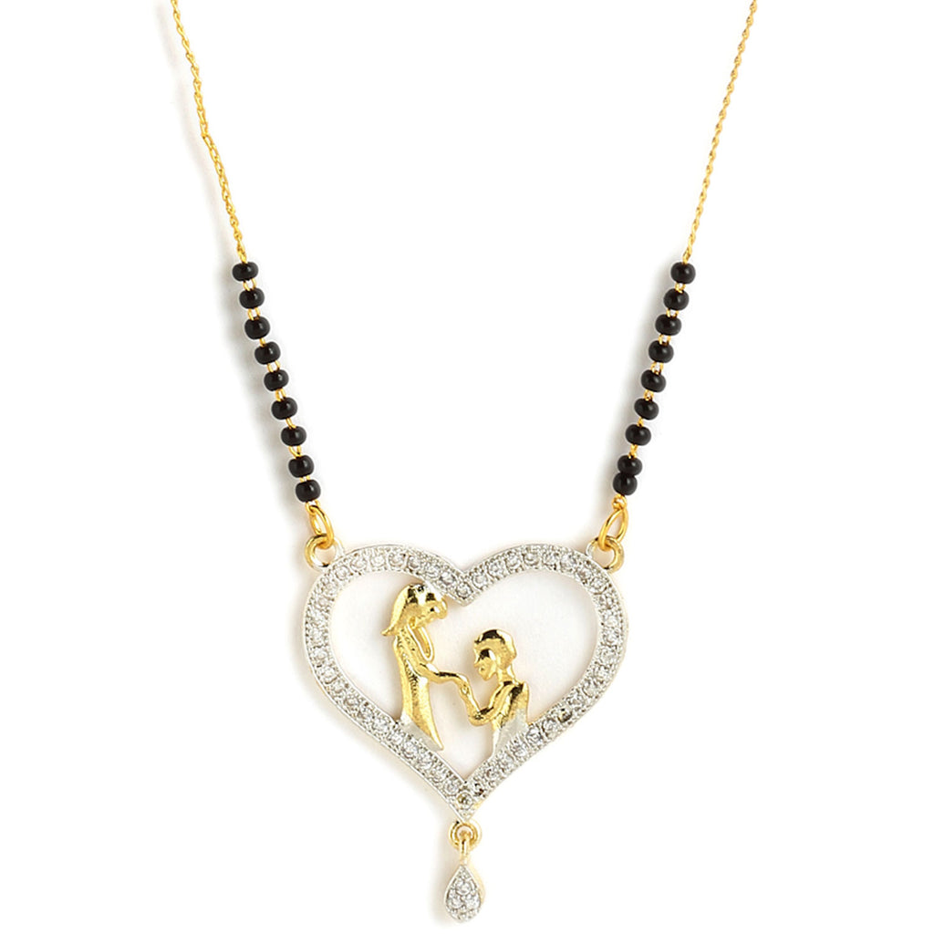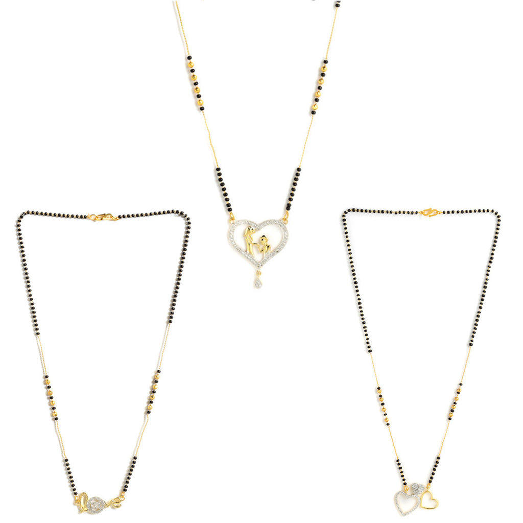 Set of 3 Gold-Plated Black & White AD-Studded & Beaded Heart Shaped Mangalsutra