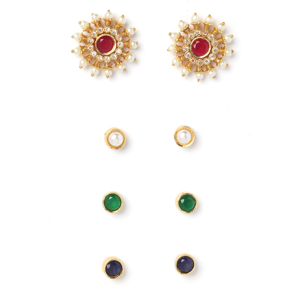 Set of 4 Gold-Toned Floral Shaped Red, Blue, Green, and White Colour Round Changeable Stud Fashion Jewellery secured with a Post and Back closure.