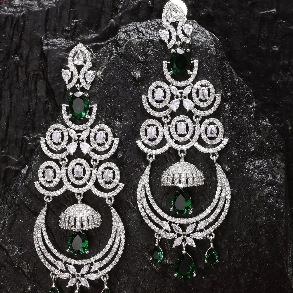 Green & White Rhodium-Plated with Silver-Tone American Diamond Chandelier Earrings