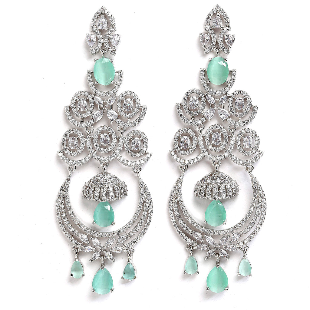 Sea Green & White Rhodium-Plated with Silver-Tone American Diamond Studded Chandelier Earrings