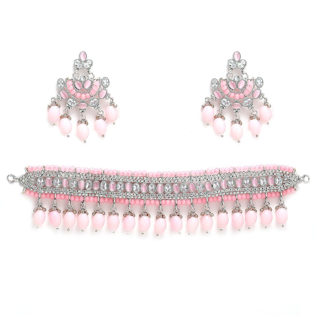 Silver-Plated Pink Kundan-Studded & Beaded Jewellery Set