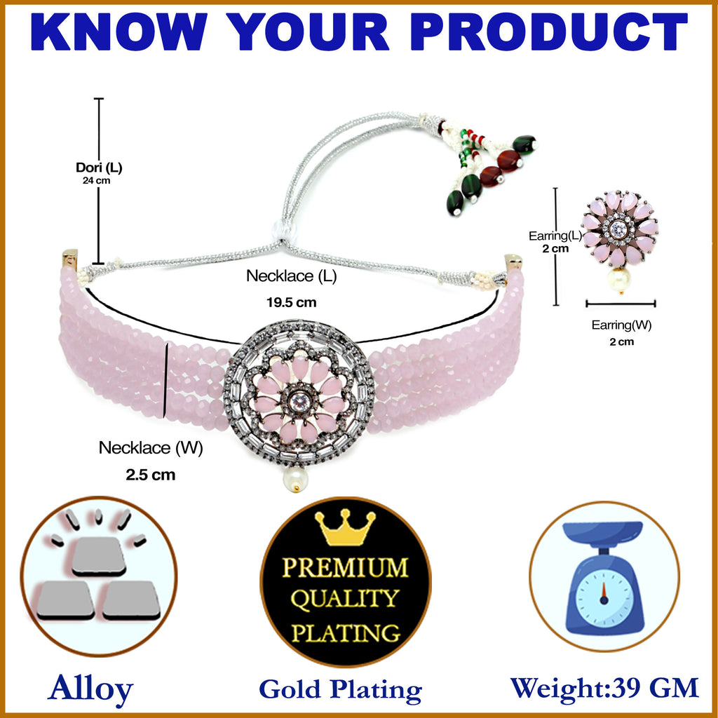 This jewellery set consists of a necklace and a pair of earrings. Rhodium-Plated with Silver-Tone pink and white stone studded multistrand pink bead oxidised choker necklace, has a drawstring closure. A pair of matching pink stone studs, secured with a post and back closure.