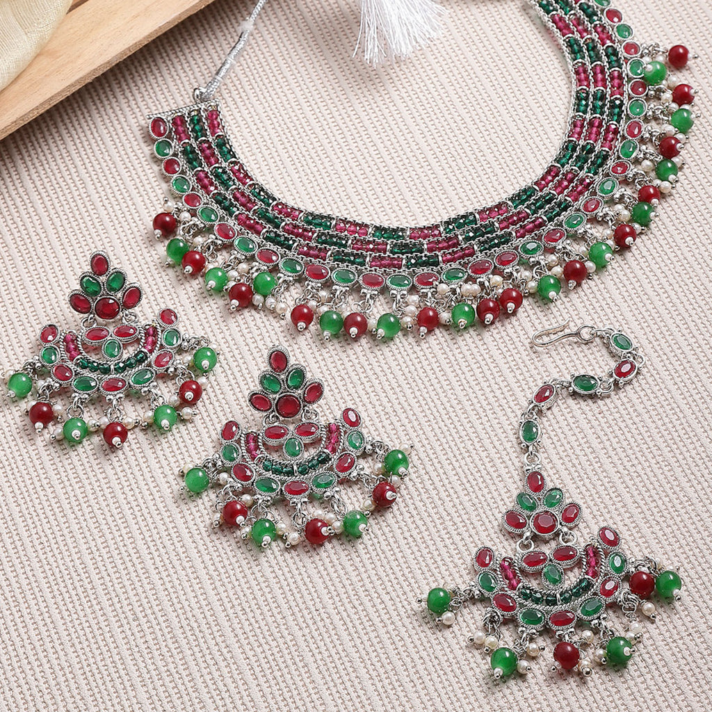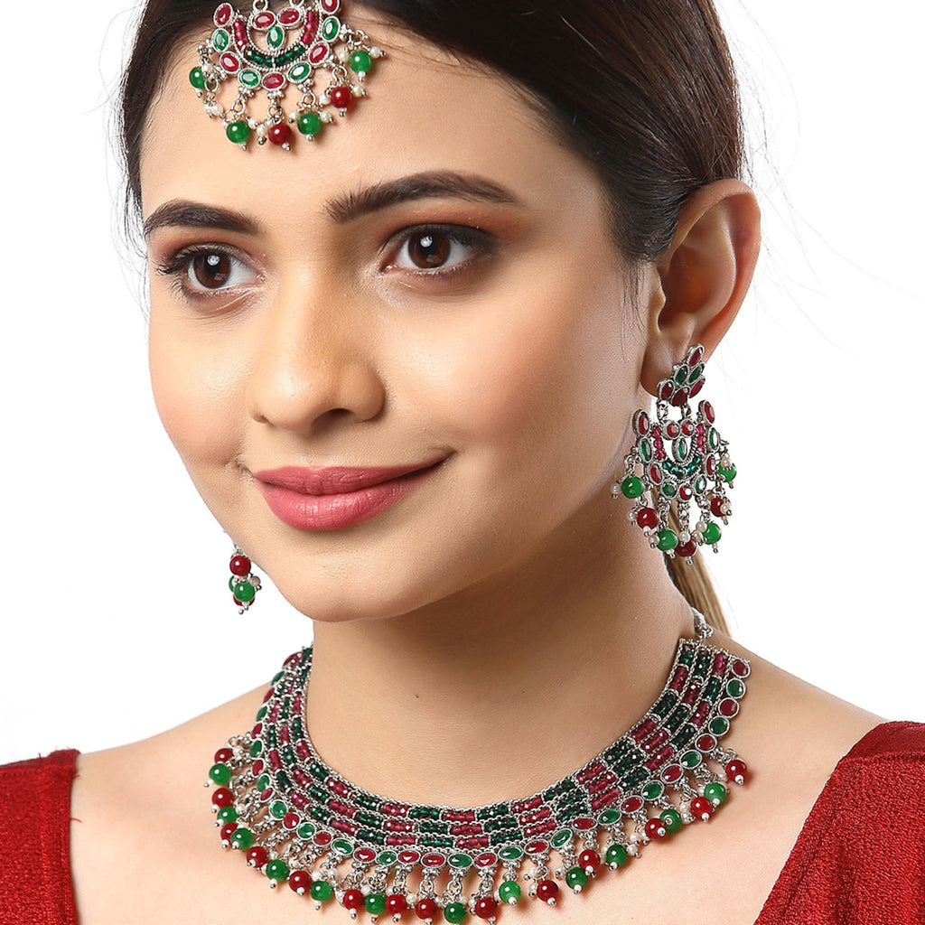 This jewelry set consists of a necklace and mang tika. Rhodium-Plated with Silver-Tone studded red & green studded necklace, secured with a drawstring closure. A pair of matching drop earrings, each secured with a post-and-back closure. A matching mang tikka secured with a post-and-back closure.