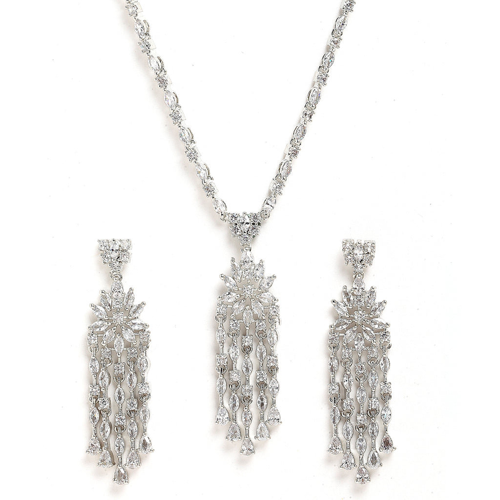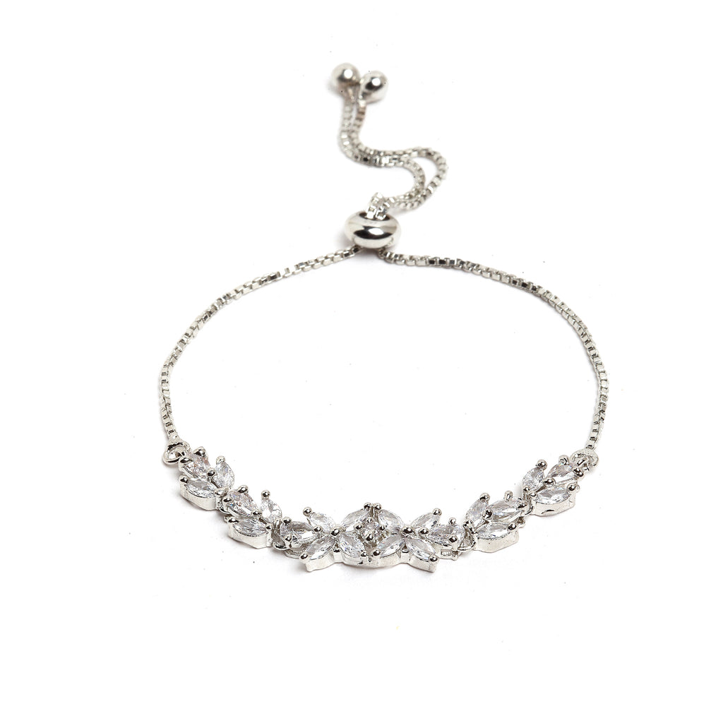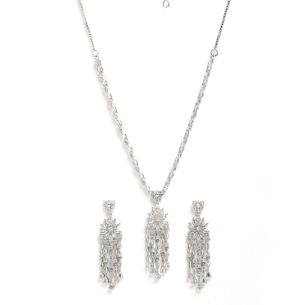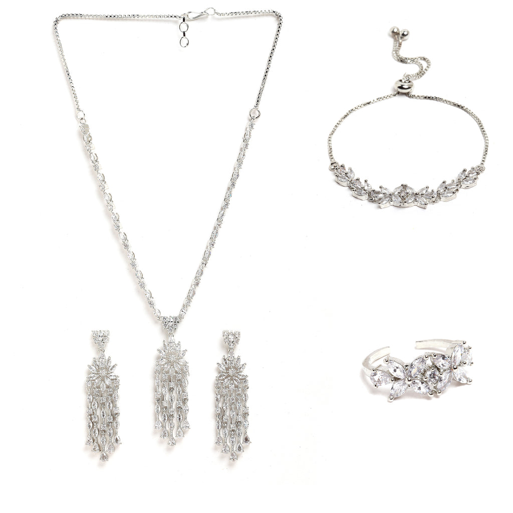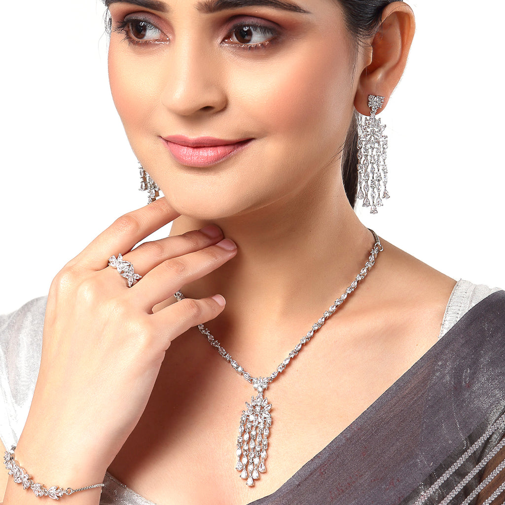 This jewellery set consists of a necklace, earrings, finger ring and bracelet. Silver-Plated necklace, has white American Diamond-studded detail secured with an S-Hook closure. A matching silver-plated ring, has American Diamond-studded detail. A matching bracelet, secured with a drawstring closure. A pair of matching drop earrings, secured with a post and back closure.