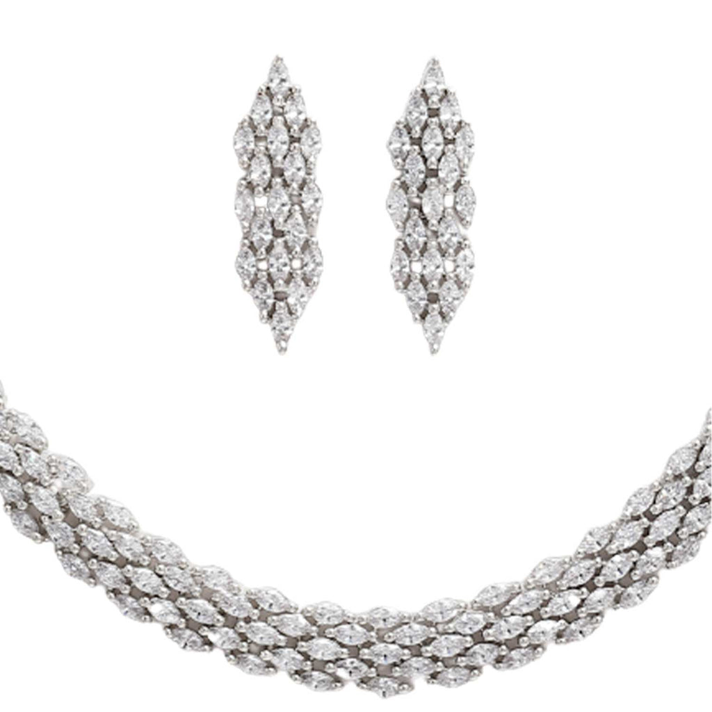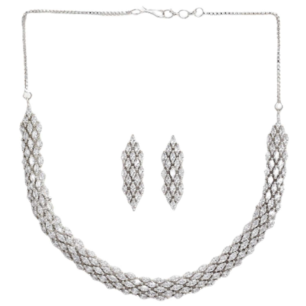 This jewellery set consists of a necklace and a pair of earrings. Rhodium-Plated with Silver-Tone white American Diamond studded textured detail secured adjustable hook closure. A pair of matching drop earrings secured with post and back closure.