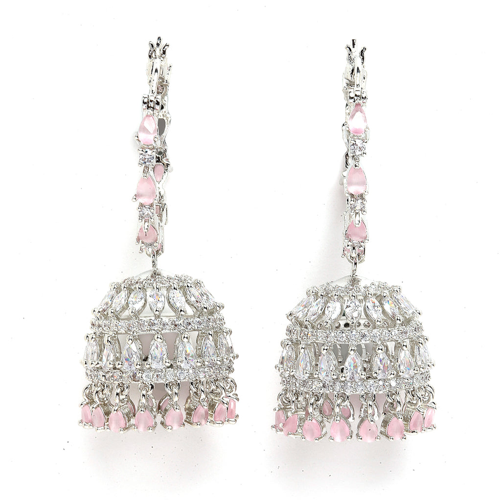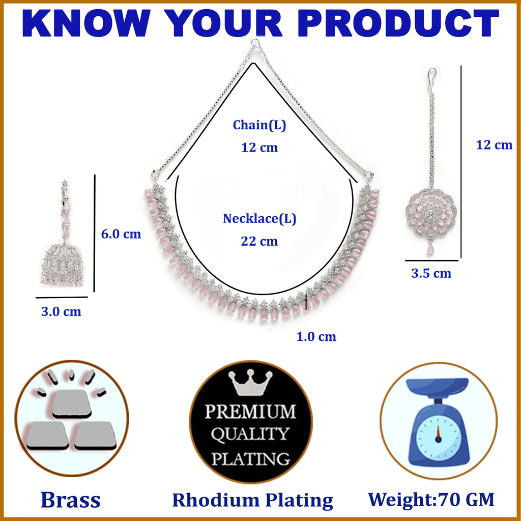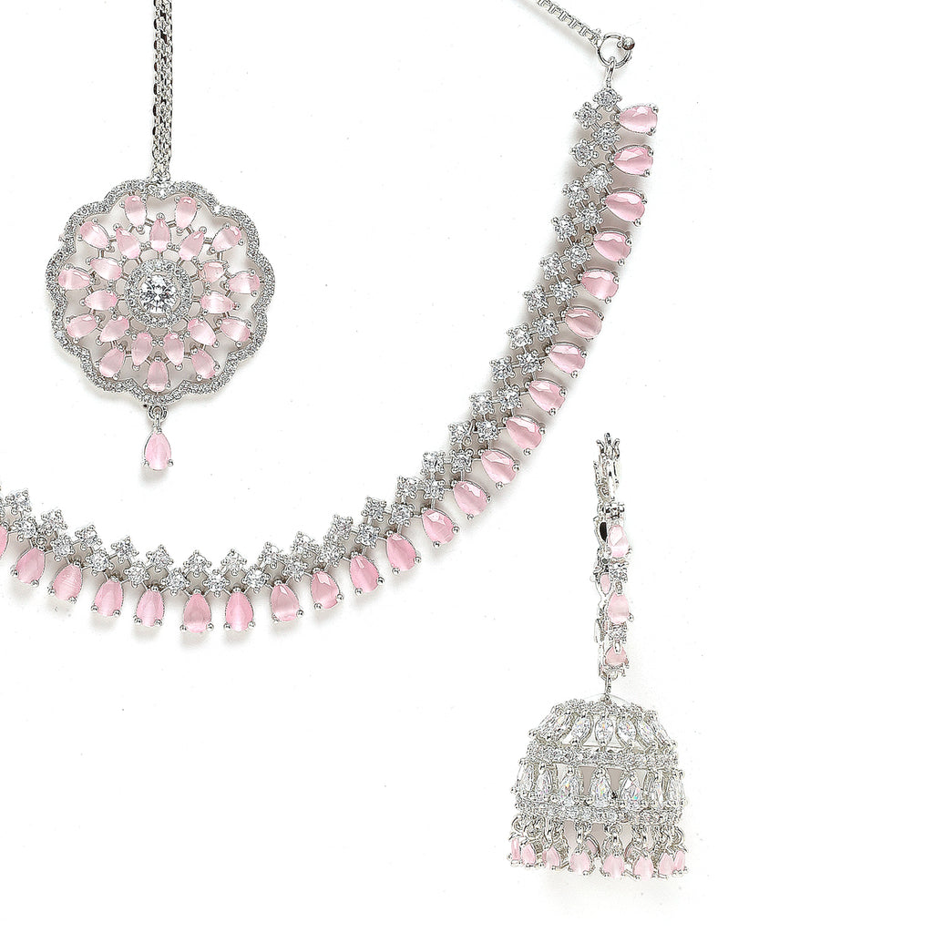This jewellery set consists of a necklace, a pair of earrings and mang tika. Silver-Toned pink and stone-studded and intricated american diamond textured detailing secured with a S-Hook closure. A pair of matching drop jhumka earrings, each secured with a lever back closure. Silver-Toned pink and studded maang tikka secured with hook closure.