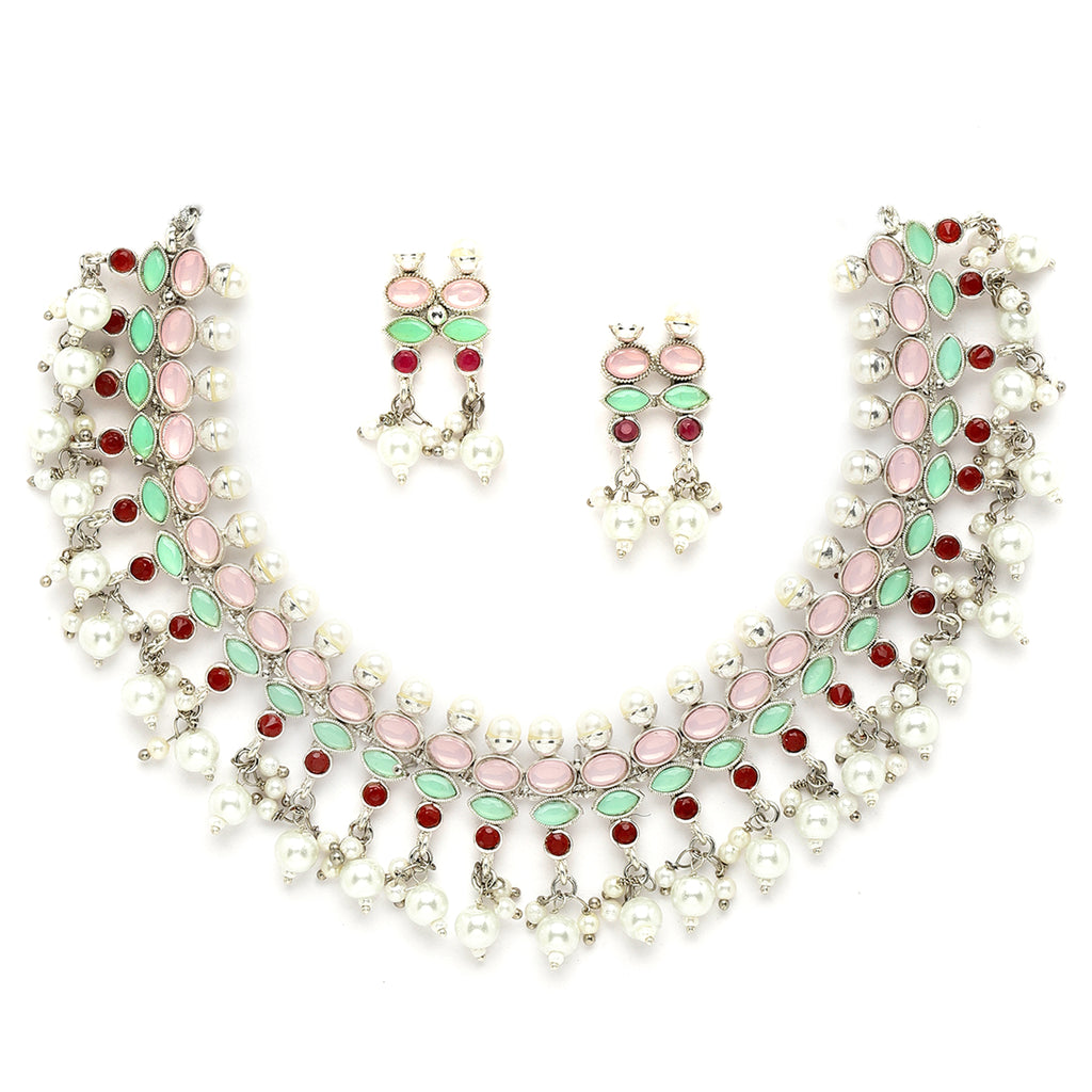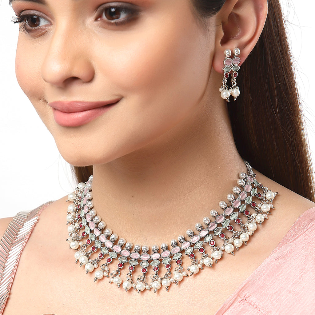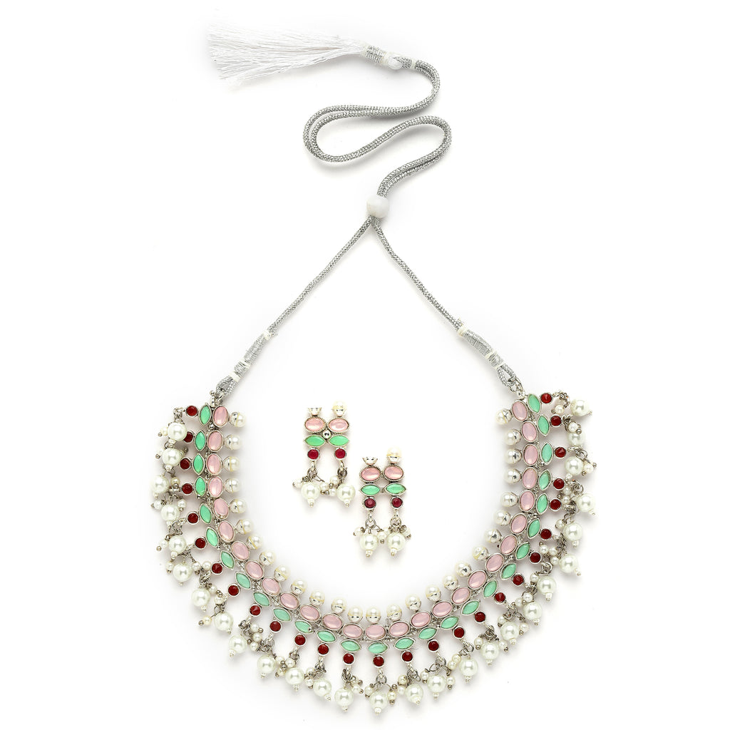 This jewellery set consists of a necklace and a pair of earrings. Rhodium-Plated with Silver-Tone Copper Necklace With Pink & Green American Diamond Studded with Drop Pearl detail, secured by drawstring closure. A pair of Matching Pink & Green American Diamond Drop Earrings, secured with a post-and-back closure.