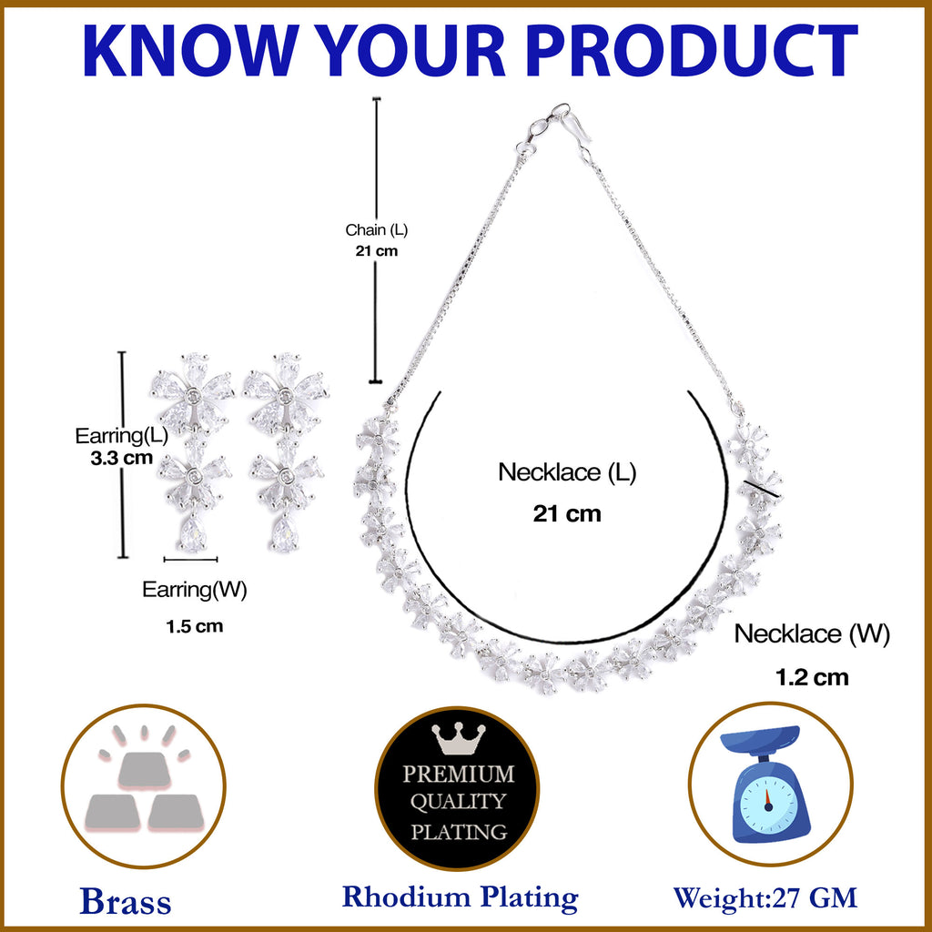 This Jewellery set consists of a Necklace and a pair of Earrings. Rhodium-Plated with Silver-Tone and white american diamond stones studded necklace secured with an S-Hook closure. A pair of matching earrings, secured with post and back closure.