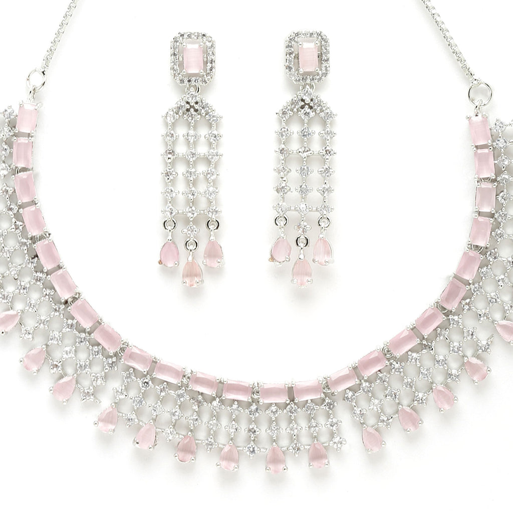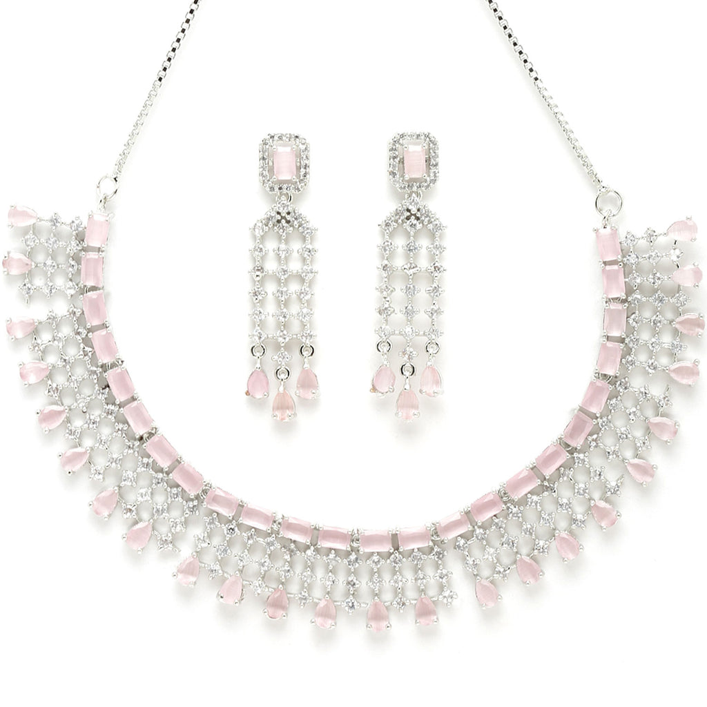 This jewellery set consists of a necklace and a pair of earrings. Rhodium-plated necklace, has pink and white American Diamond-studded detail, secured with a S-hook closure. A pair of matching drop earrings, each secured with a post and back closure.