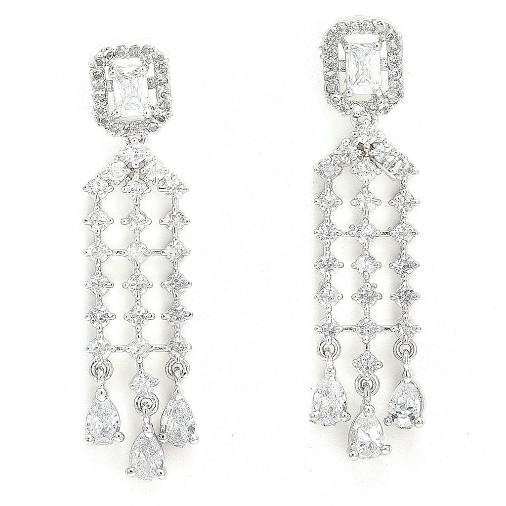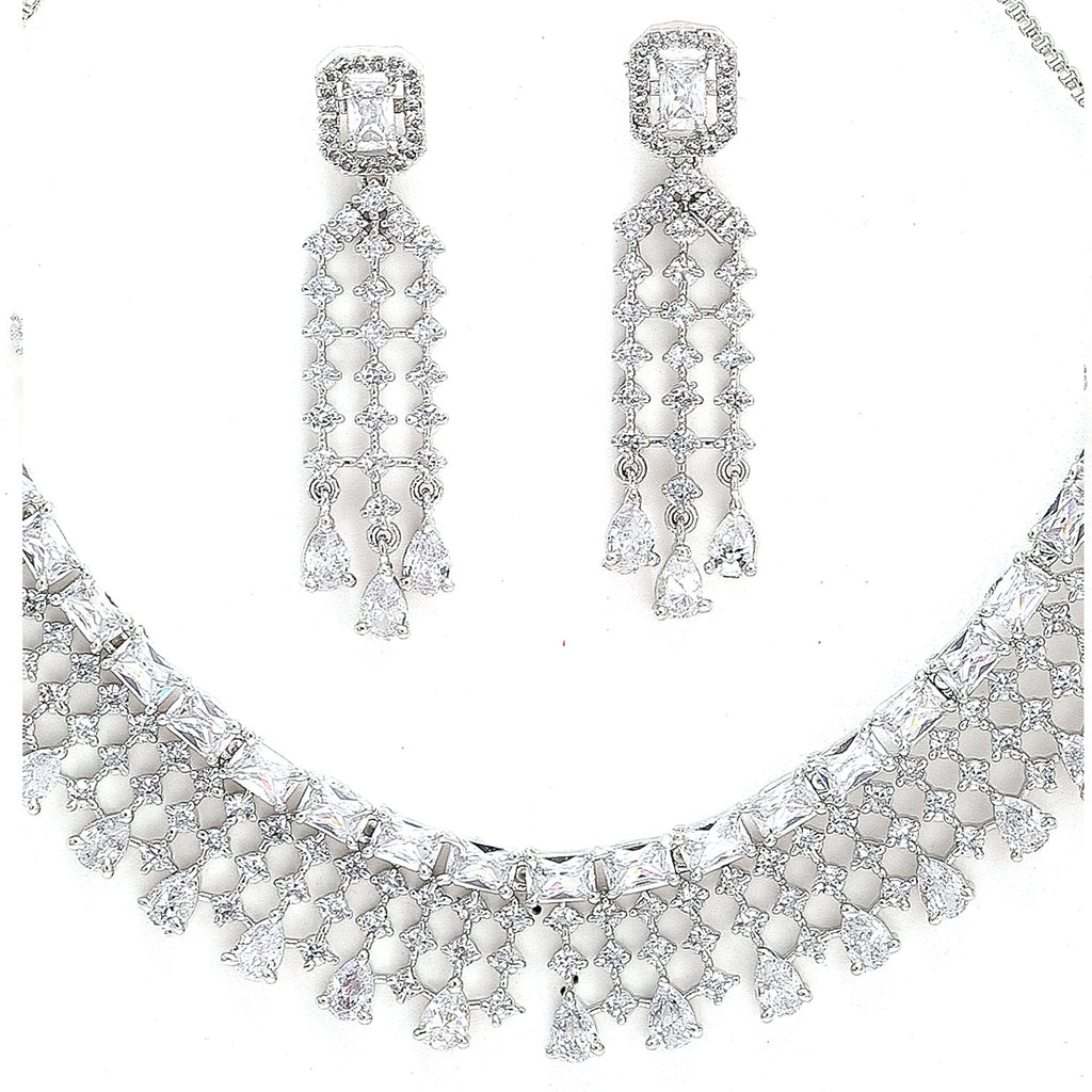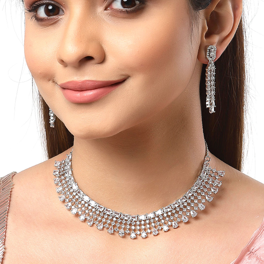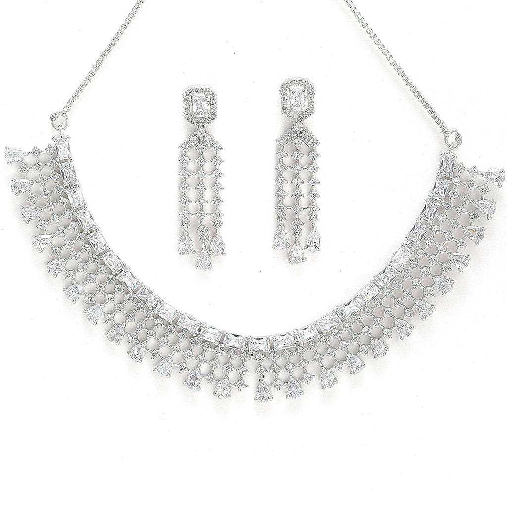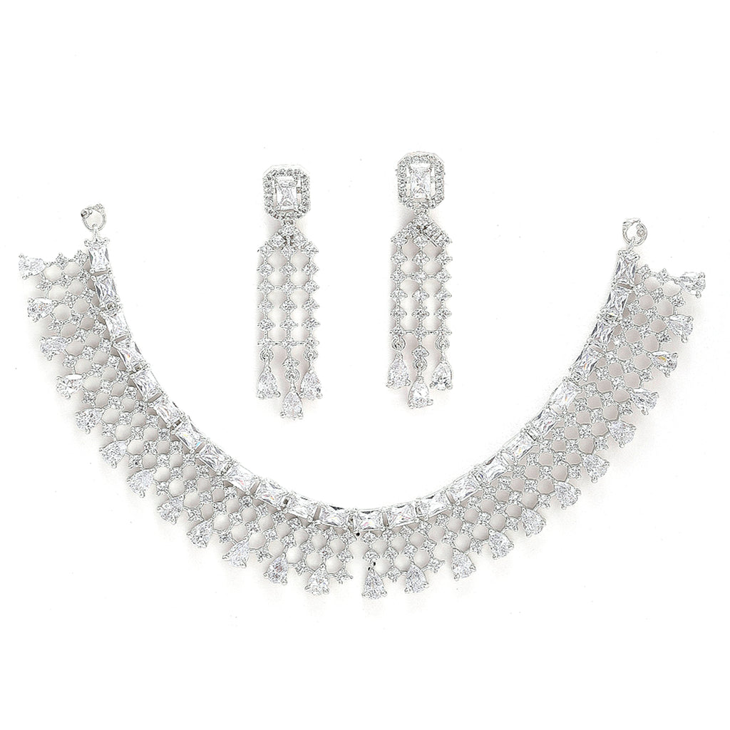 This jewellery set consists of a necklace, and a pair of earrings. Rhodium-Plated with Silver-Tone necklace, has white American Diamond-studded detailSecured with an S-Hook closure. A pair of matching drop earrings, each secured with a post-and-back closure.