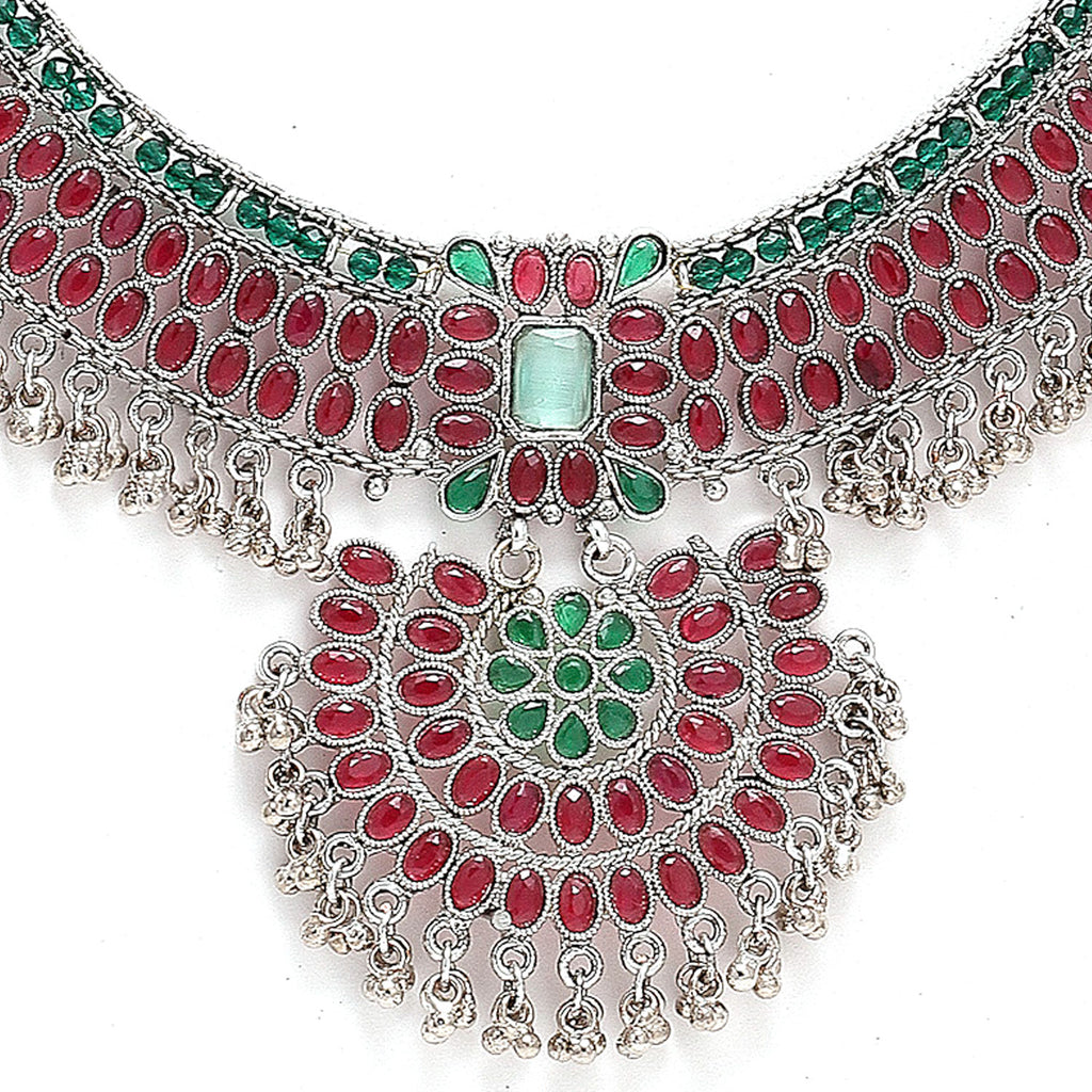 Silver-Plated Red Kundan-Studded Meenakari Jewellery Set