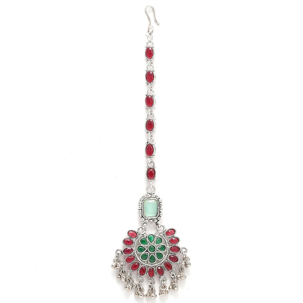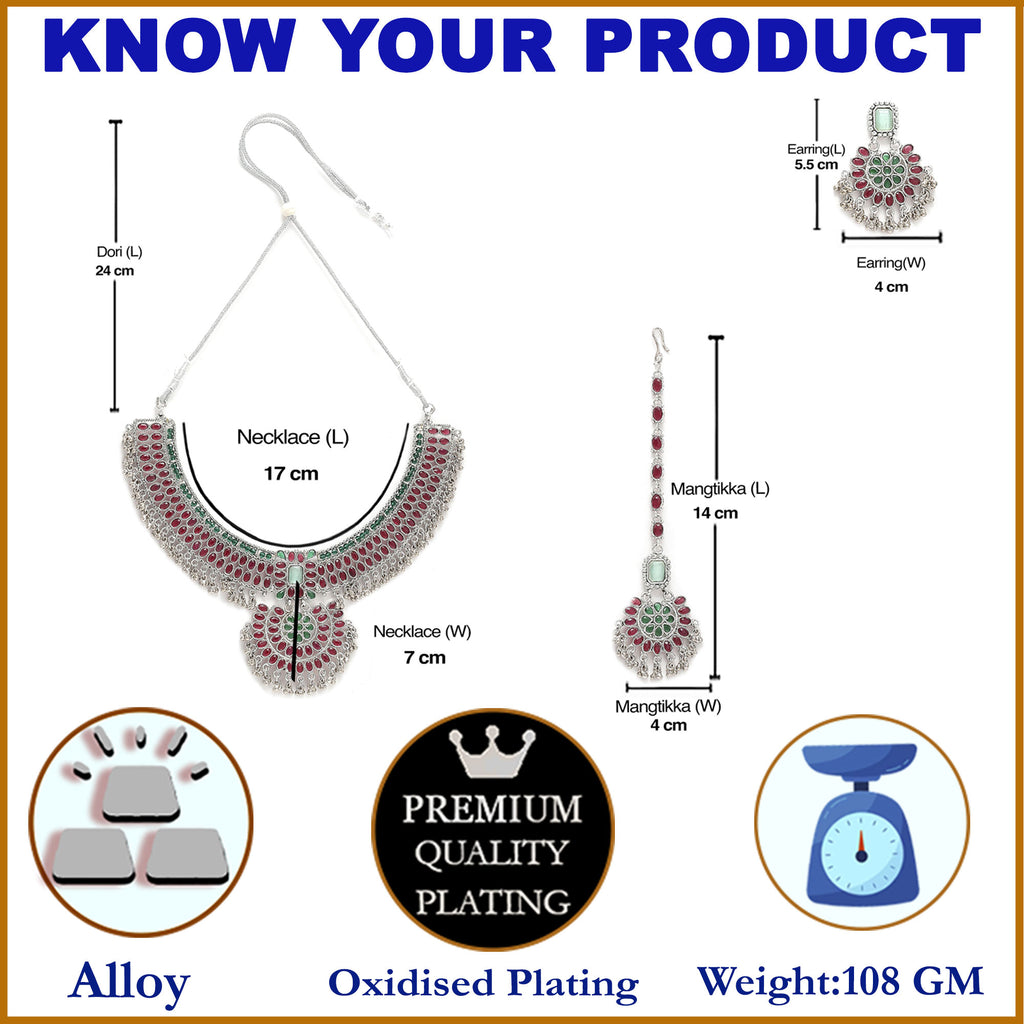 This jewellery set consists of a necklace, and mang tika. Rhodium-Plated with Silver-Tone Red Kundan Studded Rani Haar Necklace has crescent-shaped motif centrepiece, secured with a drawstring closure. A pair of matching drop earrings, each secured with a post-and-back closure. A matching mang tika secured with a post-and-back closure.