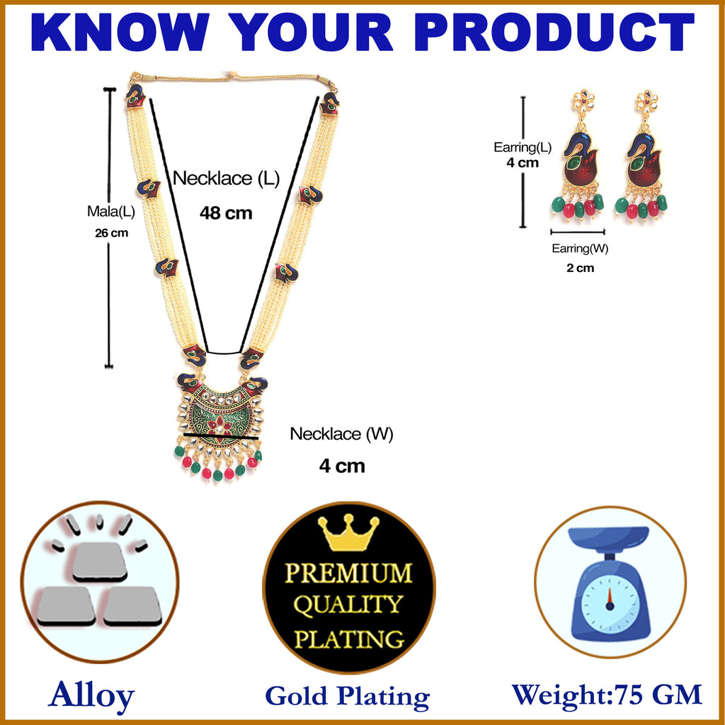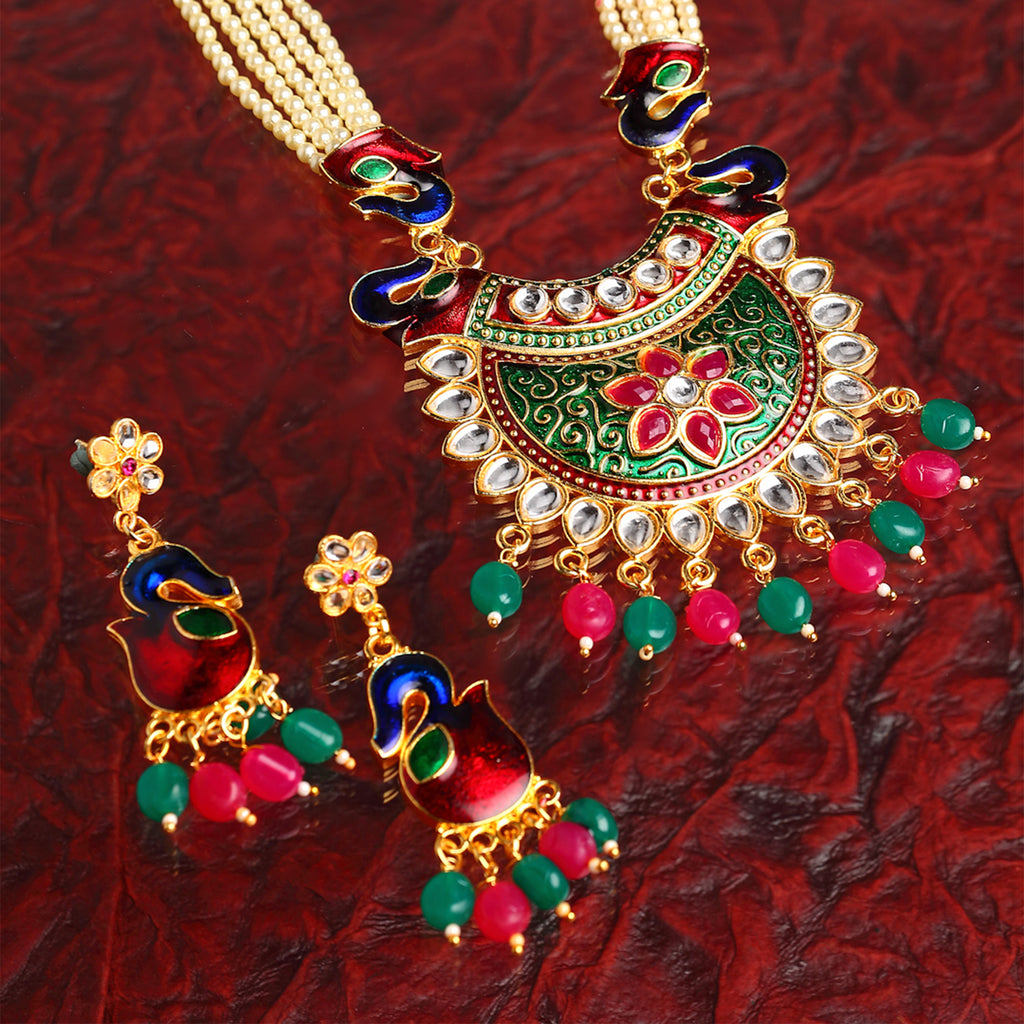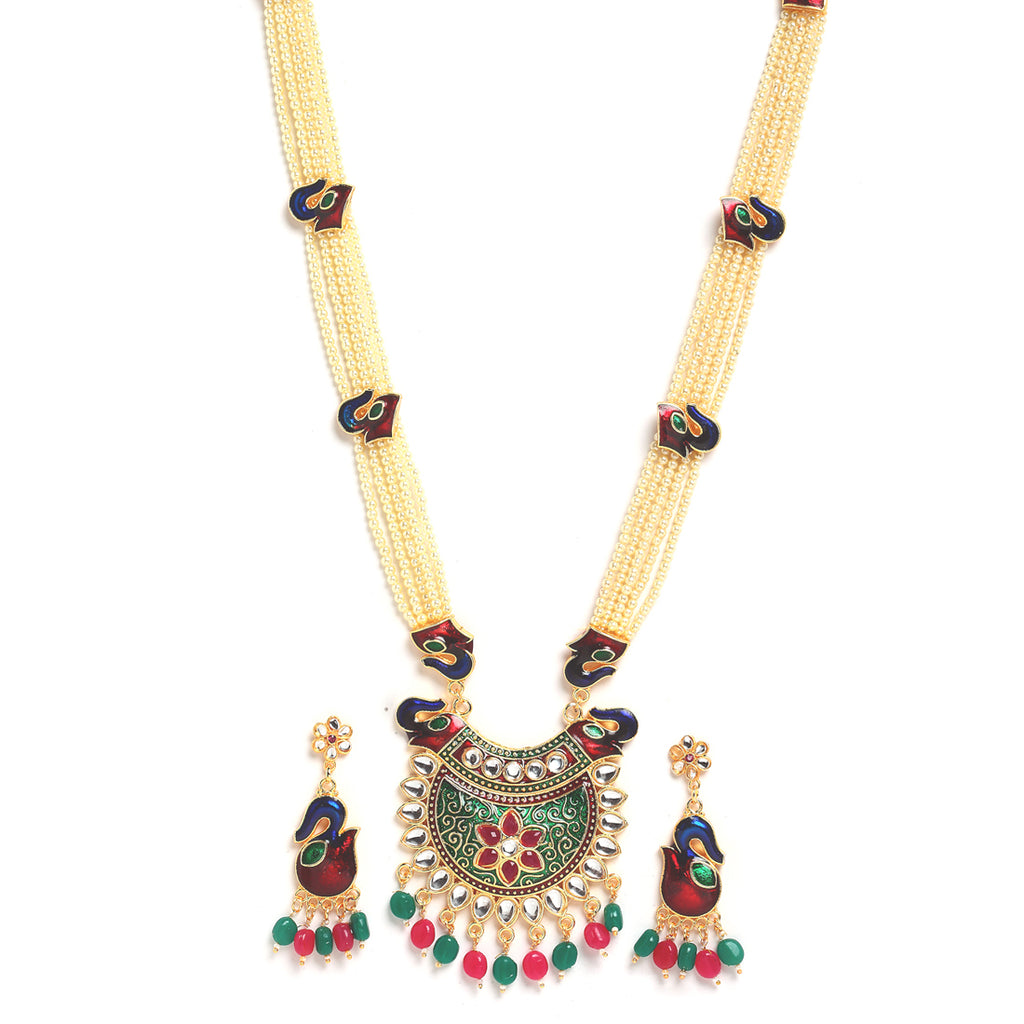 White Pearl Meenakari Pendant With Multi Strand Long Jewellery Set