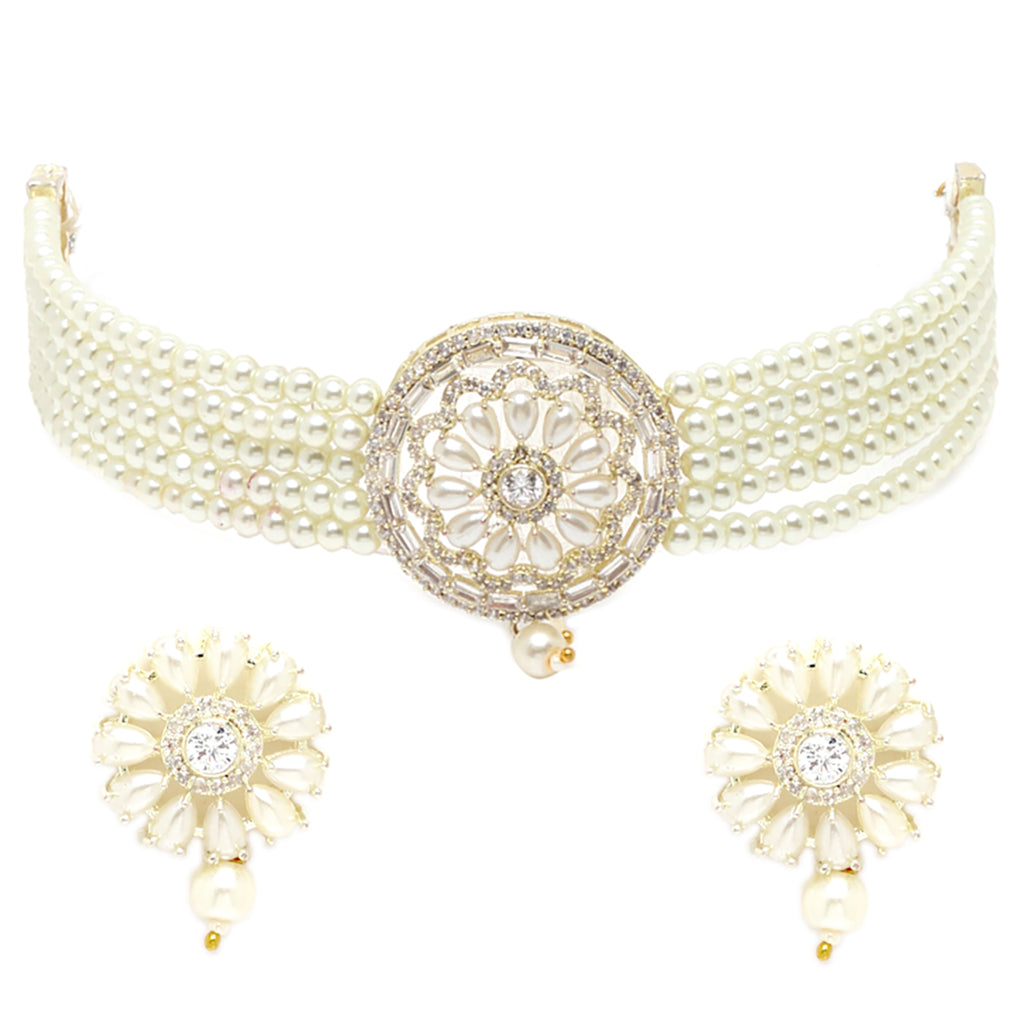 This jewellery set consists of a necklace and a pair of earrings. Rhodium-Plated with Silver-Tone white stone-studded pearl-beaded multistrand choker necklace, has a drawstring closure. A pair of matching studs, secured with a post and back closure.